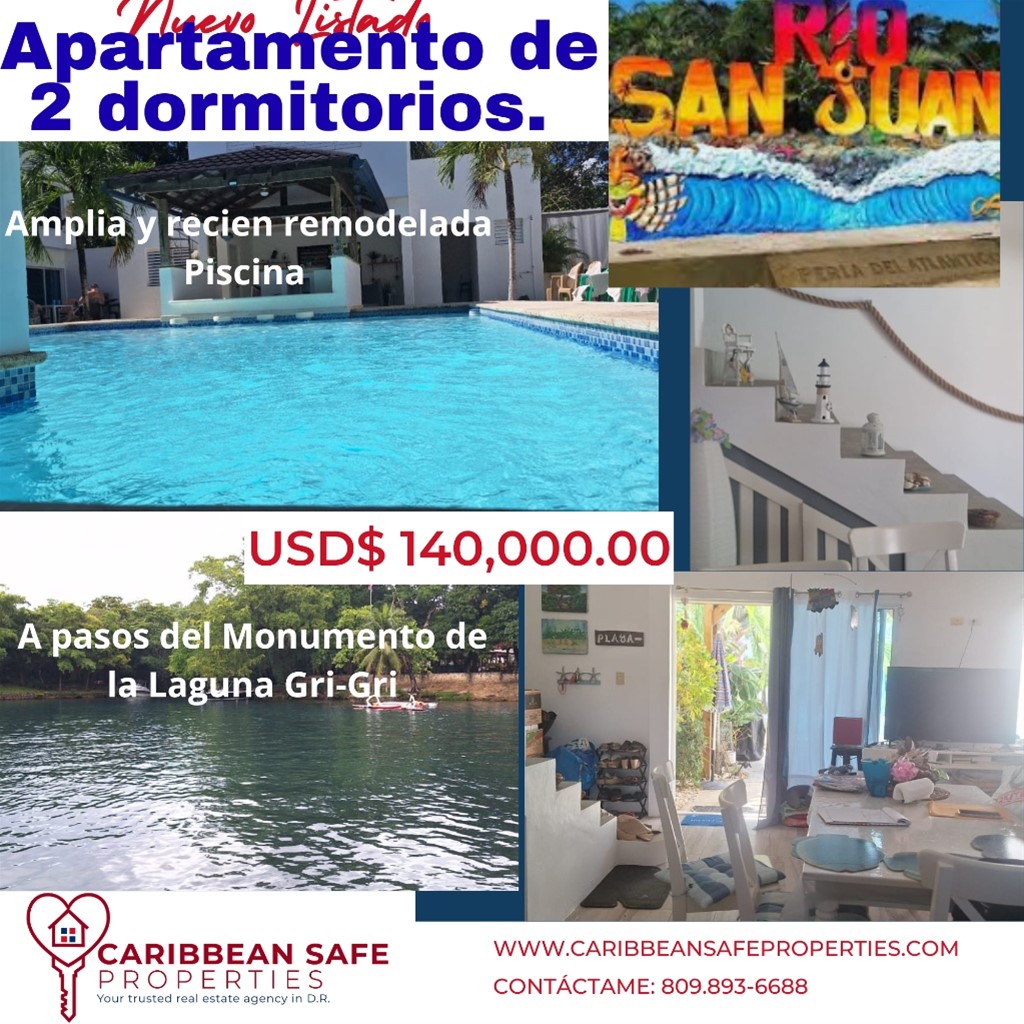 ¡Descubre tu nuevo hogar en un paraíso tropical de Río San Juan con precio ajustado! Te presentamos este exclusivo apartamento de 2 dormitorios en un residencial cerrado en Río San Juan, a solo pasos del monumento natural Laguna Gri Gri y las playas más hermosas de la zona. Un verdadero oasis con todas las comodidades que buscas: Concepto abierto de cocina, sala y comedor, ideal para disfrutar de momentos en familia. Dos amplias terrazas techadas en el primer y segundo piso, perfectas para relajarte y disfrutar de la naturaleza. Residencial con piscina, bar, área de BBQ, jardinería impecable y un sport bar para tus reuniones sociales. Solo 6 apartamentos exclusivos, lo que garantiza tranquilidad y privacidad. Además, estarás cerca de centros comerciales, restaurantes y las mejores playas del Caribe. Vigilancia 24/7, seguridad, lujo y comodidad se unen en este espacio único. ¡No dejes pasar esta oportunidad! Contáctanos hoy mismo para más detalles y coordinar una visita. Tu oasis personal te está esperando.