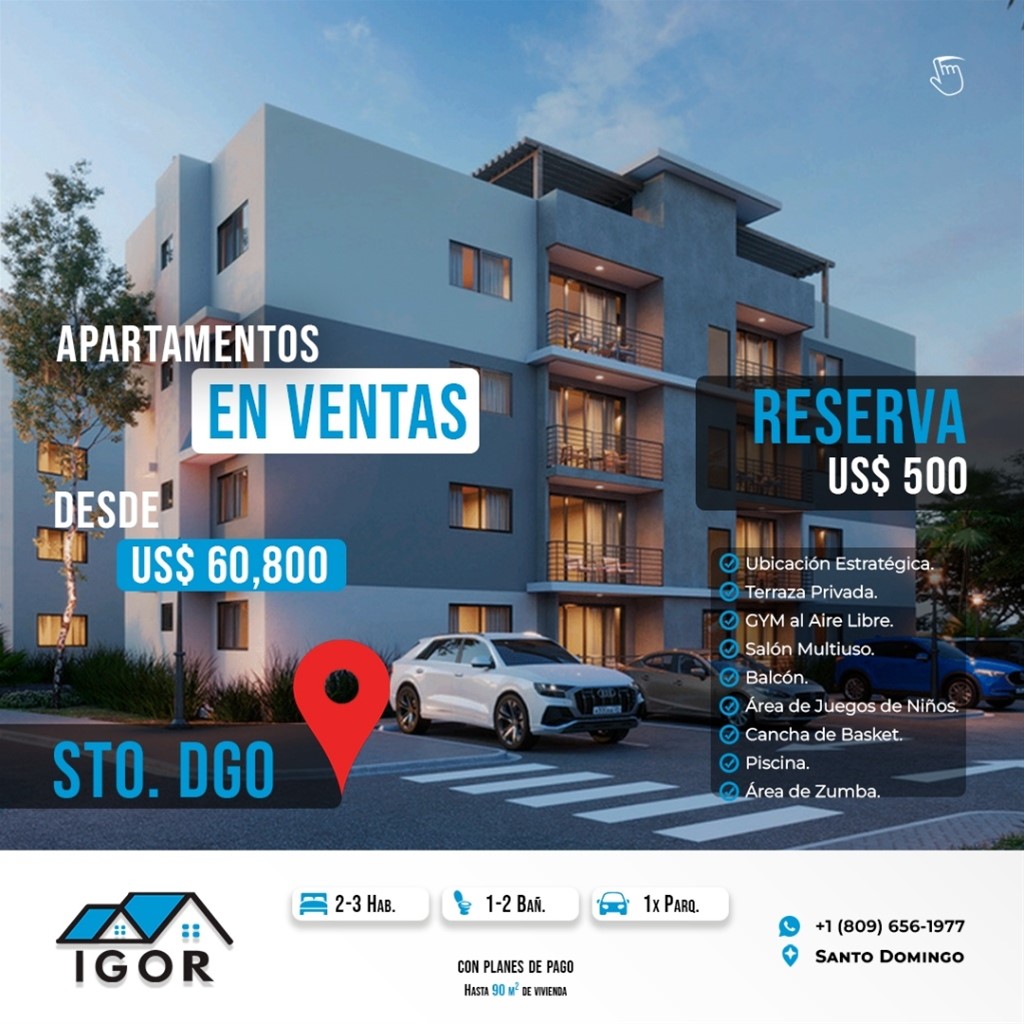 CARACTERÍSTICAS DEL PROYECTO Apartamentos de 2 y 3 habitaciones en edificios de cuatro niveles con terrazas privadas en los 4tos pisos y patio en los primeros pisos, todos con 1 parqueo. ÁREAS RECREATIVAS: Piscina semiolímpica, gimnasio al aire libre, pista de caminata, área pet friendly, 2 canchas multiusos, salón multiusos, juegos de niños, área de zumba. Entrada vehicular con garita y control de acceso en residencial completamente cerrado. TERMINACIONES Pisos en cerámica. Ventanas corredizas de aluminio y vidrio. Balcón en bandarilla metálica. Cocina en melamina con tope de granito. Puertas tipo Everdoor. Closets en melamina simulación madera. TIPOLOGÍA DE APARTAMENTOS D: 2 HAB. 55 MT2 DESDE 56,500 Cuarto piso con terraza privada de 32 mts2 US$66,600 C: 3 HAB. 65 MT2 DESDE US$67,900 Primer piso con patio de 4 mts2 US$73,300 Cuarto piso con terraza privada de 32-40 mts2 US$79,600 B: 3 HAB. 75 MT2 DESDE US$76,700 Primer piso con patio de 7 mts2 US$82,700 Cuarto piso con terraza privada de 34-42 mts2 US$89,700