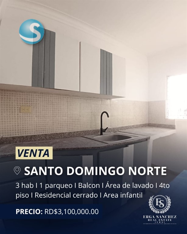 Apartamento Listo Para Mudarse en SANTO DOMINGO NORTE A pocos minutos del supermercado Bravo y Colinas Mall CARACTERISTICAS Y AMENIDADES: Residencial cerrado con seguridad 24/7 Garita de entrada Gazebo Area para niños 3 habitaciones 1 baño remodelado Sala - comedor Cocina Área de lavado Balcón integrado 4to piso 1 parqueo 64.40m2 VENTA: RD$3,100,000.00 negociable #KL