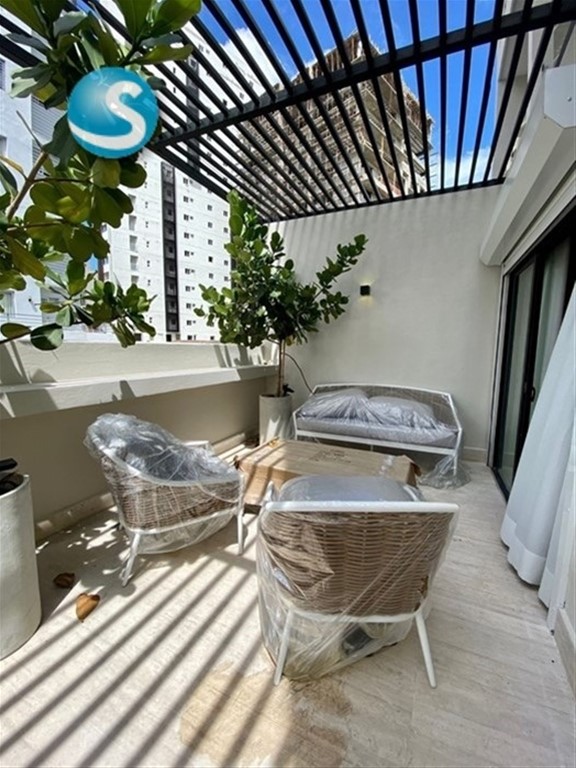 Apartamento de 120 Mts2, de 2 habitaciones con su baño, Tope de cuarzo, pisos en porcelanato, Semi amueblado Aire, estufa, nevera, papel tapiz, tv con base, cortina, muebles de terraza, vinera y camas, shutters automático, jacuzzy privado. Cristian Manuel