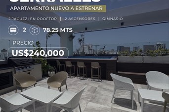 Apartamento en venta nuevo a estrenar Serrallès Precio de Venta US$ 240,000 Metraje 78.25 Neto Mas un parqueo de 13.80 Total metraje 92.05 2 Habs ( principal con Baño y w/c en Sabina 2 Baños Piso en Marmol Línea blanca incluida Techo Enchirro Sala/ Comedor Cocina abierta en Cuarso blanco Balcón Cuarto se maquina de Lavado 1 parqueo Techado Amenidades: Lobby tipo hotel 2 jacuzzi en Rooftop de la torre Gym Area de lounge con bar interno y salon multiuso Amplia Terraza con Kitchenette y BBQ 2 Ascensores