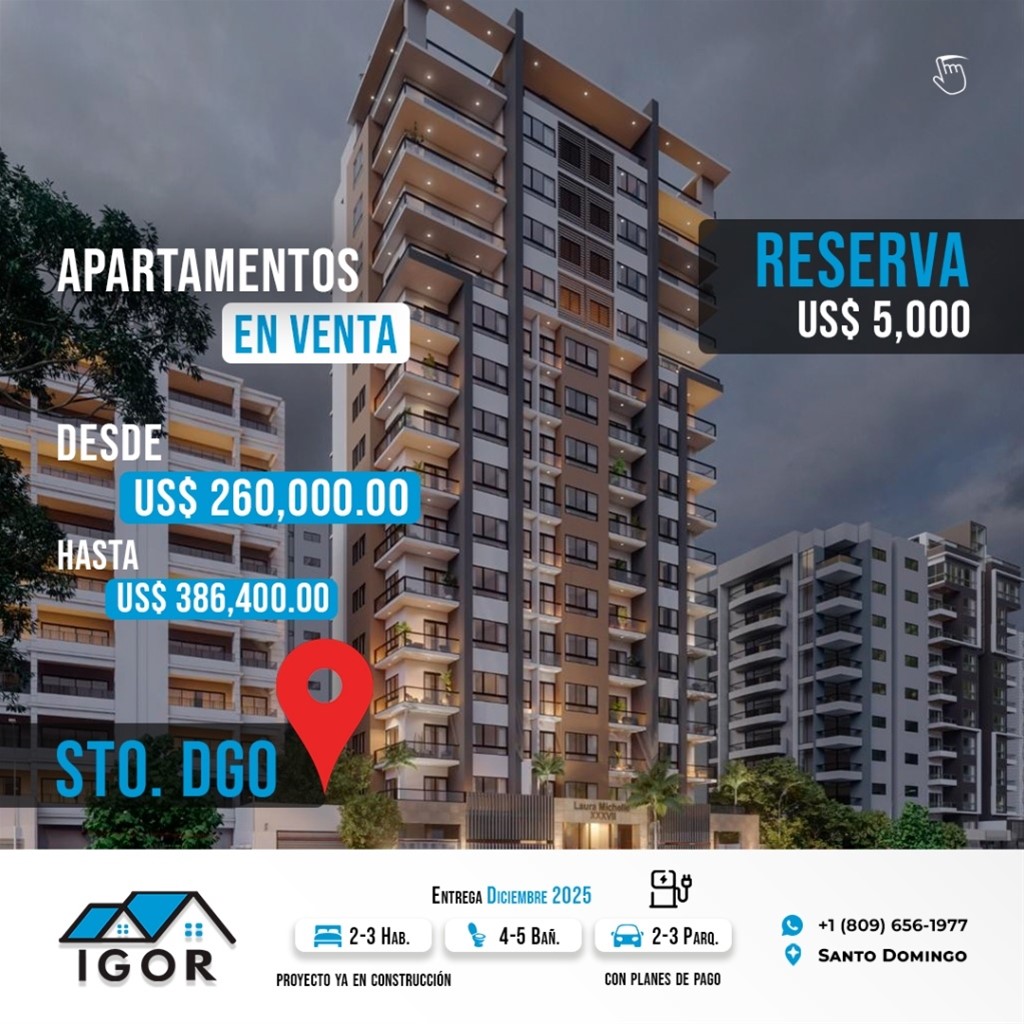 Torre LM XXXVI - Apartamentos en VENTA Santo Domingo. DESDE US 260,000.00 HASTA US 386,400.00 RESERVA US 5,000 Contará con: Terminación de Primera. Seguridad 24/7. Lobby. GYM. 2x Piscuzzi. 2x Ascensores. Área Infantil. Ebanistería de Madera Preciosa. Planta Full. BBQ. Pista de Caminar. Cuarto de Chóferes. Cine. Salón de Reuniones. Terraza Privadas. Cámaras de Seguridad. Terraza Privada. Opción de Carros Eléctricos en Parqueo.