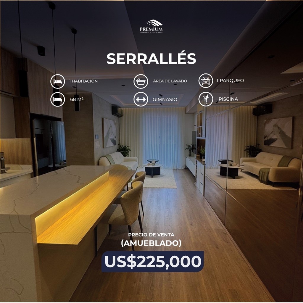 Serralles ! Apartamento nuevo a estrenar Amueblado completo ! 1 habitación 68 metros 1 parqueo 1 baño Area de lavado Balcón Área social Piscina Gym Precio de venta US$225,000