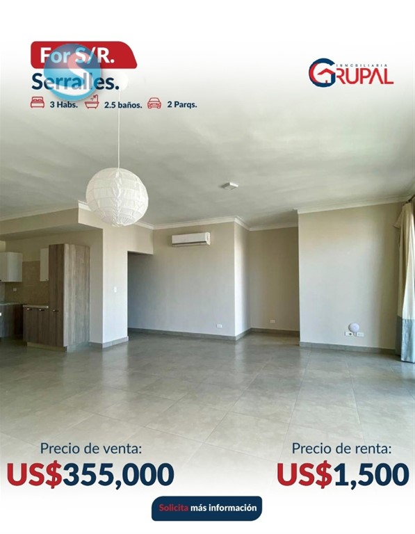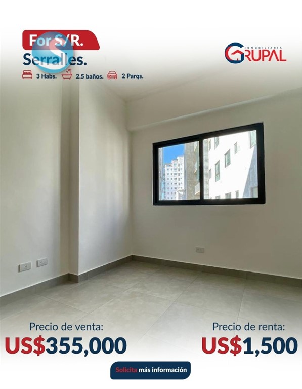 Apartamento en venta con espectacular vista despejada en el centro de a ciudad - Serralles?? ?????????????????????????????? ?????? ?????????????????????? ?3 habitaciones ?2.5 baños ?Sala ?Comedor ?Cocina con desayunador ?Balcón ?Área de lavado ?Habitación de servicio con baño ?2 parqueos paralelos ?????????????????????????????? ?? ???????????????????? ???? ???? ?????????? ??Gimnasio ??Jacuzzi ??Terraza techada y destechada ??Área infantil ??Lobby climatizado ???????????? ???? ???????????????? US$1,500???? ???????????? ???? ?????????? US$355,000???? ? Información: 809-454-7240