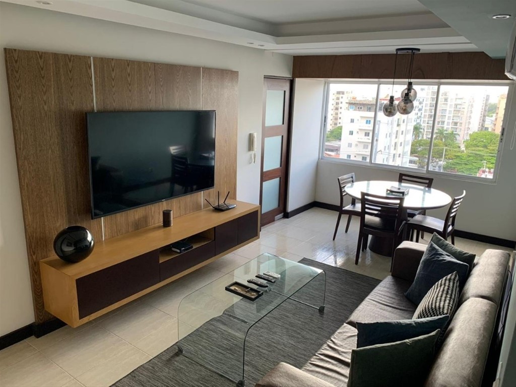 Apartamento en venta en la exclusiva zona de Ensanche Serralles 69 Mt2 128,000 $US Amueblado 1 habitación 1 baño Sala Comedor Cocina 1 parqueo techado Características del edificio Portón eléctrico 2 Ascensores Luz 24 hrs Planta full Gas común Conserje