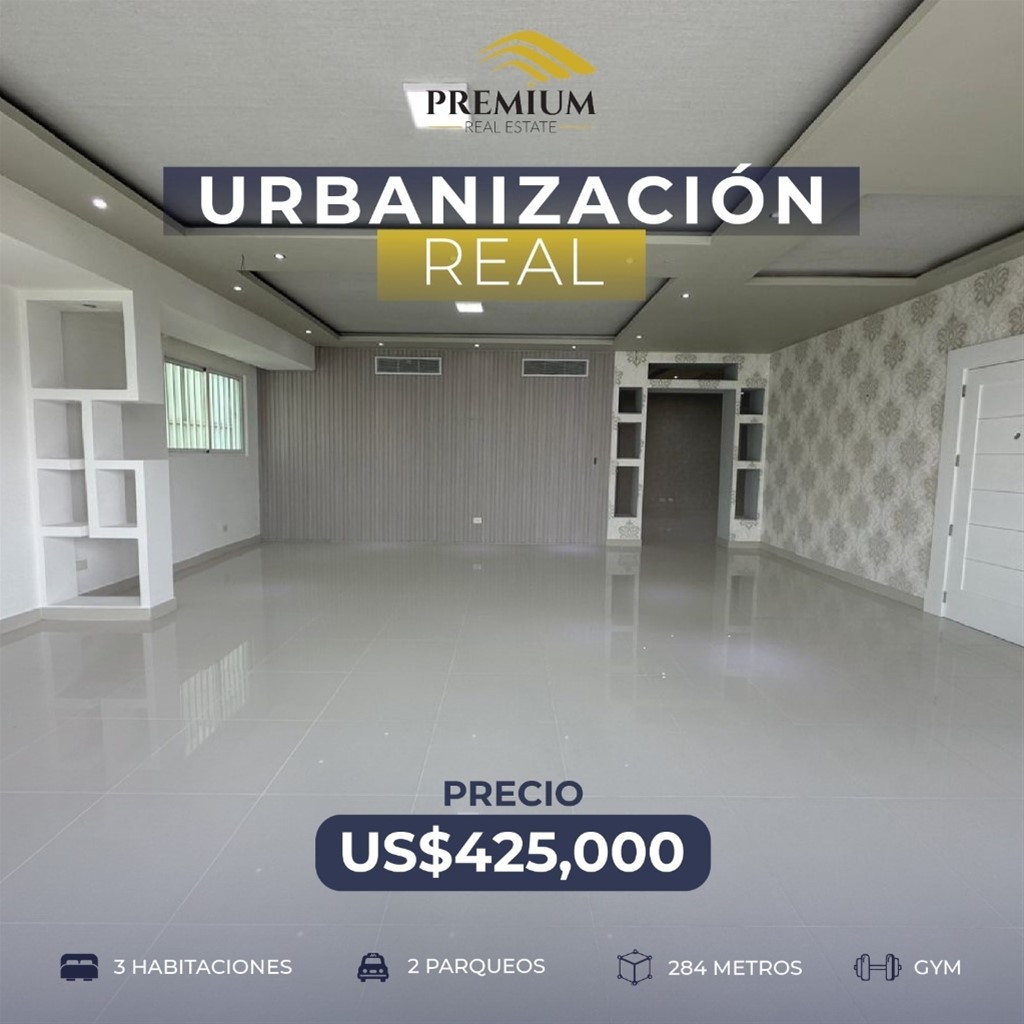 Urbanización Real Piso 7 284mts 3 habitaciones (cada una con W/C y baño) Baño para visitas Balcón amplio Family room Sala Comedor Cocina fría Cocina caliente Cuarto de servicio con su baño Área de lavado 2 parqueos Ascensor Planta Full Gas común Lobby Gimnasio Precio de venta: US$425,000 Mantenimiento: RD$10,700