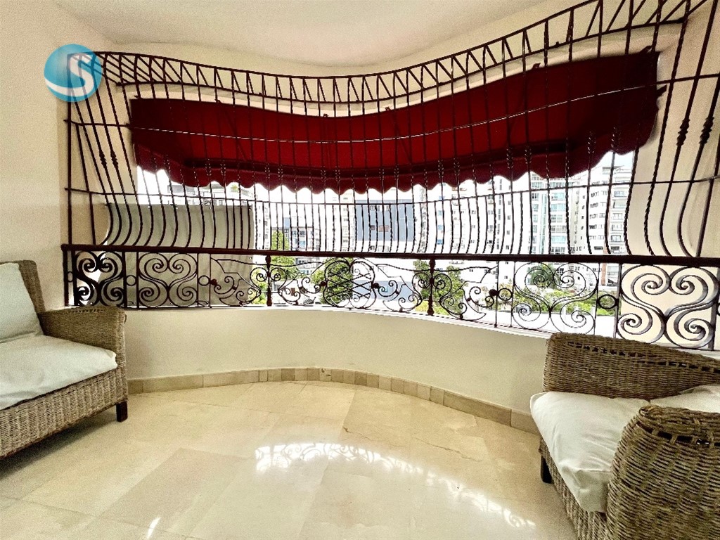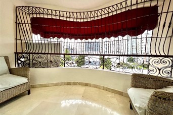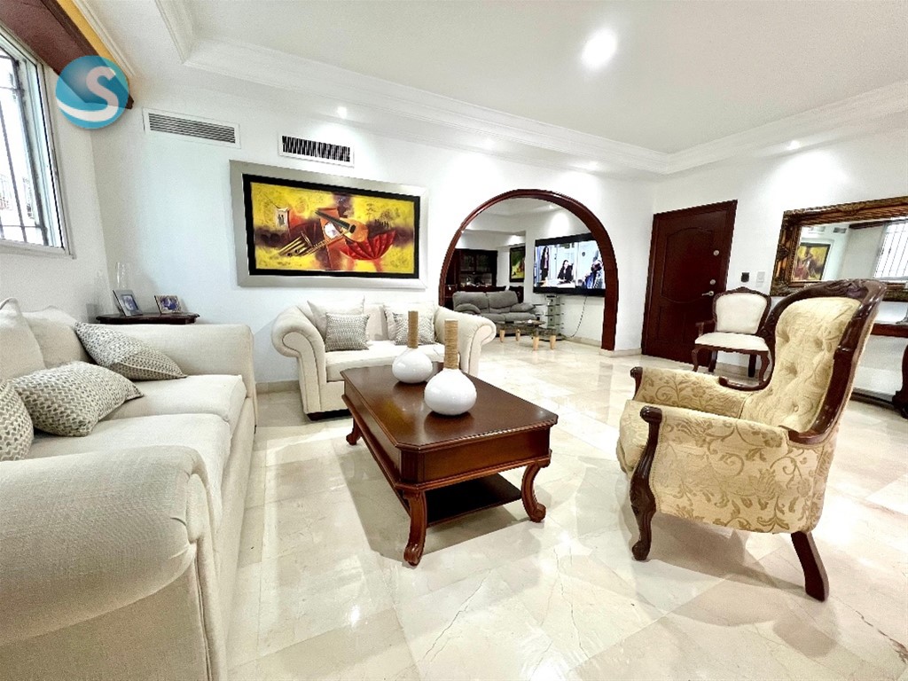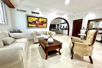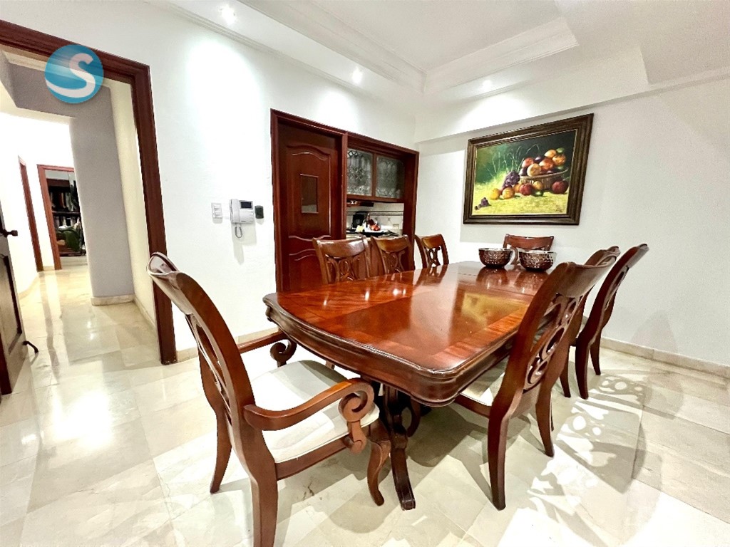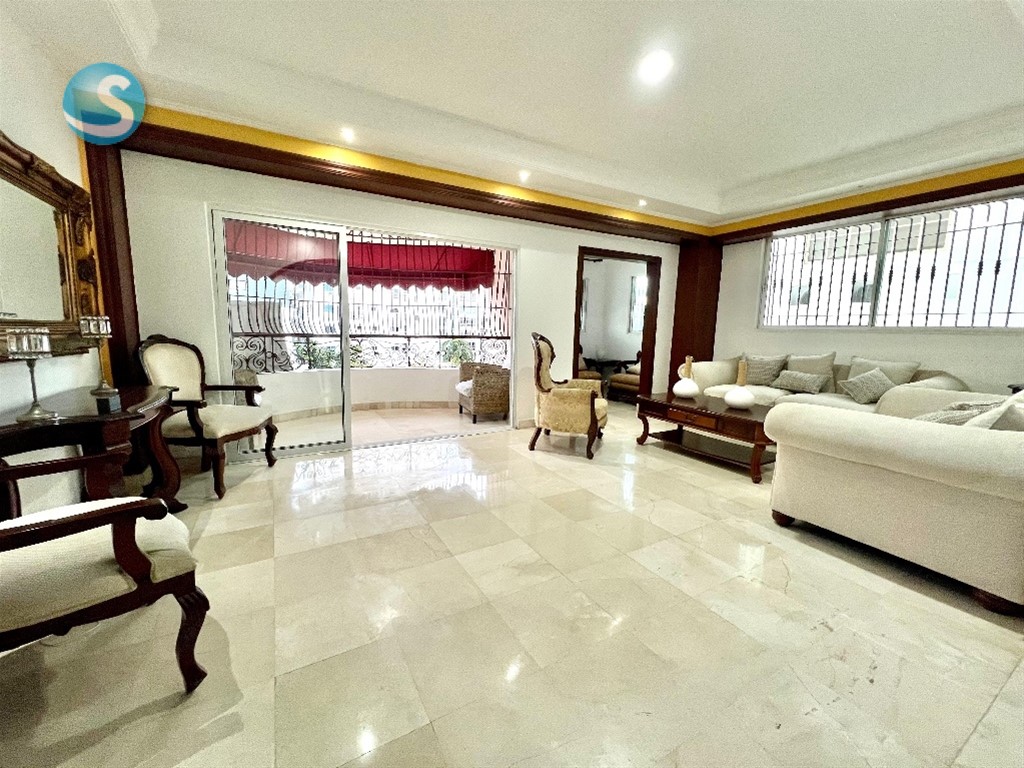Muy buen apartamento, en torre localizada estratégicamente en Urbanización Real, orientacion sur-norte. 6to nivel 3 habitaciones cada una con su baño 1/2 baño Amplia sala Estar familiar Estudio pegueño Balcón grande Comedor Cocina desayunador Área de lavado Cuarto de servicio Escalera de servicio 2 parqueos techados paralelos Pisos en mármol, madera caoba.