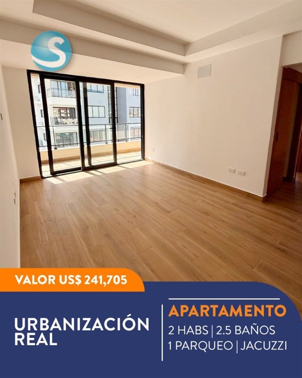 ? Fantástico apartamento en Urb.Real? Exclusiva propiedad, diseñado para brindarte una experiencia de vida moderna y funcional en cada detalle. ?? Característica del Apartamento • 88.25 m² • 2 habitaciones • 2 baños • ½ Baño • 1 parqueo ?? Amenidades de la Torre • Elegante lobby • Ascensor e intercom • Área social con jacuzzi • Área de lockers • Gas común con medidor • Portón eléctrico • Planta eléctrica full • Cisterna y pozo • Seguridad privada • Cámaras de vigilancia 24/7 ?? Precio desde: US$219,387.50