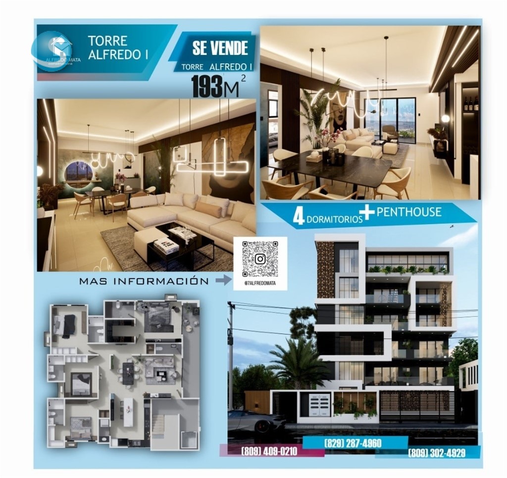 Torre Alfredo I, Residencial moderno y exclusivo solo 5 unidades+ pent-house. en una de las urbanizaciones de mayor crecimiento en la ciudad de Santiago (Urb. Thomen) Ubicado en la Urbanización Thomen Calle #16 sala, comedor, cocina, amplio balcón, área de lavado, closet ropa blanca, 4 habitaciones, 4.5 Baños, 2 Parqueo. Con amenidades como: -PLANTA ELECTRICA FULL -PORTON ELECTRICO -INTERCOM CON CAMARA -CISTERNA -GYM -TERRAZA TECHADA -AREA BBQ -PICUZZY 1/2 BAÑO AREA DE DUCHA Precios: DESDE LOS 318,500 US$ Forma de Pago: 10% del Valor del Apartamento con la firma del contrato de compra 90% con fondos propios o préstamo con el banco de su preferencia contactos: Jeison Mata Fernández 829-287-4960 Jean Luis Kunhardt Brito 829-805-9233 Alfredo de Jesús Mata 809-302-4929 Emelyn Mata Fernández 809-409-0210