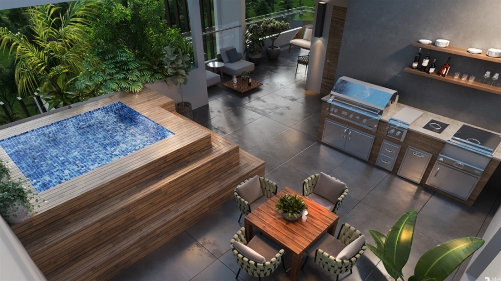 Proyecto de apartamentos ubicado en la Jacobo Majluta. Cinco torres de 11 pisos de apartamentos de 105 metros, todos de 3 habitaciones, dos baños y dos parqueos. Dos ascensores en cada torre. Primer piso con patio y PH con terraza. Áreas sociales con GYM y Piscina