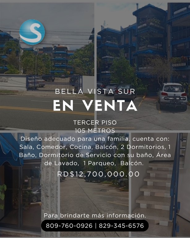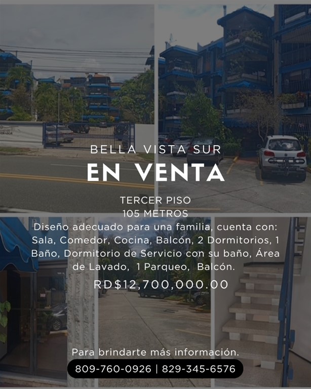 Diseño adecuado para una familia, cuenta con: Sala, Comedor, Cocina, Balcón, 2 Dormitorios, 1 Baño, Dormitorio de Servicio con su baño, Área de Lavado, 1 Parqueo, Balcón. edificación de tipo Residencial de un Apartamento, arquitectónicamente adecuado al tipo de entorno, ya que es un criterio viviendista el que impera en la zona. Está bien concebido observando amplitud en cuanto a criterio técnico desde el punto de vista arquitectónico, funcional, espacial y estructural, y está bien conservado siendo pocos los daños que el tiempo necesariamente acarrea en cualquier edificación ya que se trata de una edificación de aproximadamente 30 a 40 años de construcción. Frente al parque Mirador Sur Y a pocos metros de Bella Vista Mall, Down Town Mall, Almacenes Unidos, Av. Sarasota, Av. Anacaona, Parque Mirador.