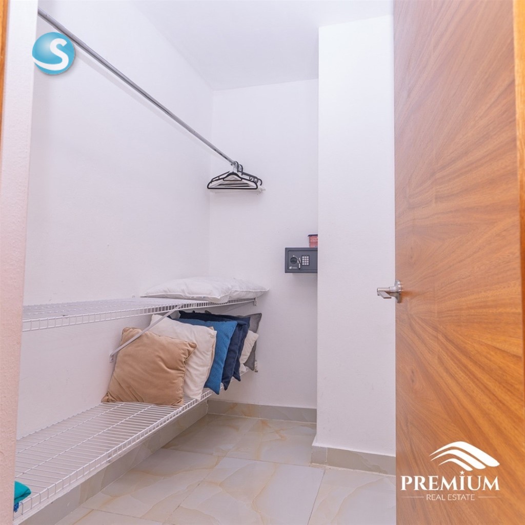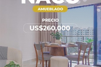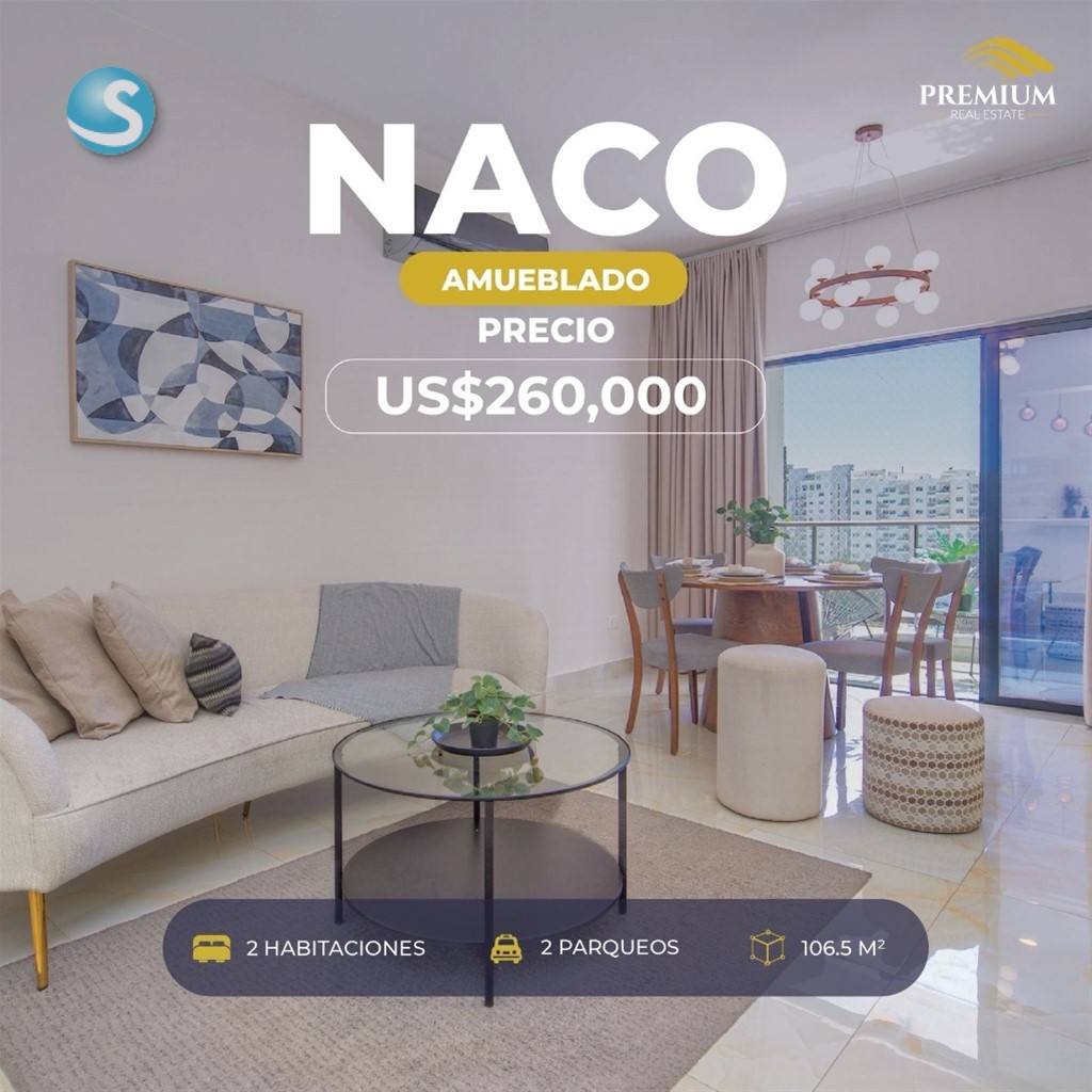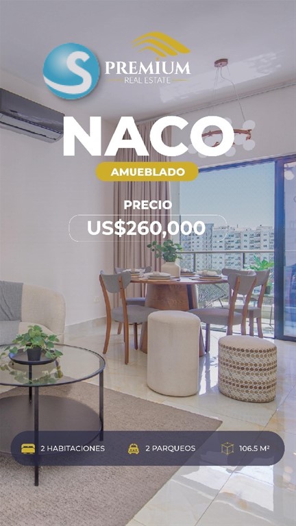 Naco | Distrito Nacional Nivel alto 106.5 m² 2 habitaciones 2 baños 2 parqueos soterrados Sala Comedor Cocina Balcón con vista abierta Walk-in closet en habitación principal Construcción moderna Acceso controlado Lobby climatizado Área social con terraza y BBQ 2 picuzzis Gimnasio equipado Sala de cine Salón de eventos Totalmente amueblado Ubicación estratégica en el Distrito Nacional Precio USD$260,000.00