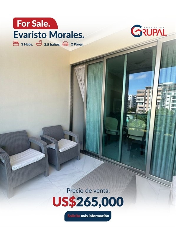 VENTA DE APARTAMENTO CON ESTUDIO EN EVARISTO MORALES?? ?????????????????????????????? ?????? ?????????????????????? ?3 habitaciones ( principal con walk in clóset y baño ) ?2 baños completos ?Medio baño para visita ?Balcón frontal ?Estudio ?Sala ?Comedor ?Cocina fría ?Desayunador ?Cocina caliente ( se puede hacer) ?Área de lavado ?Habitación de servicio con baño ?2 Parqueos paralelos soterrados ?????????????????????????????? ???? ???? ?????????? ??Torre familiar ??2 ascensores de última generación ??Lobby climatizado amueblado ??Piscina ??Jacuzzi ??Área para bbq ??Área de niños ??Gimnasio ??Salón multiuso climatizado ??Gas común ??Seguridad 24/7 ??Cámaras de seguridad ??Conserje ???????????? ???? ?????????? US$265,000???? ? Información: 809-454-7240 Carlos Tejeda