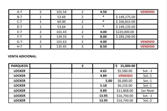 VENDO APTOS. EN TORRE DE 1, 2 Y 3 HABITACIONES DESDE 53.64mts. CON 2 Y 3 PARQUEOS TECHADOS EN EL SECTOR DE GAZCUE. CARACTERISTICAS DEL PROYECTO: - LOBBY AMUEBLADO Y CLIMATIZADO - ÁREA SOCIAL CERRADA Y CLIMATIZADA EN EL ÚLTIMO NIVEL - GIMNASIO EQUIPADO Y CLIMATIZADO EN EL ÚLTIMO NIVEL - CÁMARAS DE SEGURIDAD DE CIRCUITO CERRADO - VIDEO PORTEROS - PLANTA ELÉCTRICA FULL - ÁREA Y BAÑO PARA CHOFERES - DUCTO DE BASURA - SISTEMA CONTRA INCENDIOS - GAS COMÚN - POZO DE AGUA - CISTERNA CON 2 BOMBAS DE AGUA - PROYECTO CERRADO, CON PORTONES ELÉCTRICOS - 2 ASCENSORES - BAÑO PARA CONSERJE - JARDINERÍA - DISEÑO ANTISÍSMICO CARACTERISTICAS DE LOS APARTAMENTOS: - BALCÓN - SALA - COMEDOR - MODERNA COCINA CON EXCELENTE ILUMINACIÓN - ÁREA DE LAVADO - CUARTO DE SERVICIO CON SU BAÑO (LOS DE 2 Y 3 HABS.) - MEDIO BAÑO DE VISITAS - 1,2 Y 3 HABITACIONES CON SU BAÑO CADA UNA - LOCKERS DE DEPÓSITO (LOS DE 2 Y 3 HABS.) - 2 PARQUEOS TECHADOS POR APTO., LOS DE 1 Y 2 HABS. - 3 PARQUEOS TECHADOS POR APTO., LOS DE 3 HABS. - CLOSET DE ROPA BLANCA - PREINSTALACIÓN DE AIRES ACONDICIONADOS - FACIA EN ÁREAS SOCIALES TERMINACIONES: - PISOS DE PORCELANATO - TECHOS DE YESO - PUERTAS DE MADERA PRECIOSA - CERÁMICA IMPORTADA EN BAÑOS - COCINAS MODULARES CON TOPES DE GRANITO NATURAL - GRIFERÍA IMPORTADA - VENTANAS, PUERTAS CORREDIZAS Y BARANDAS DE BALCONES EN ALUMINIO Y VIDRIO. DISPONIBLES: APTOS. DE 1, 2 Y 3 HABITACIONES, CON 2 Y 3 PARQUEOS, ALGUNOS APTOS. CON LOCKER, DESDE 53.64mts. A 135.45mts. - US$141,200.00 A US$283,240.00 CONTACTO: JAZMÍN ORTIZ DE CONDE Y MAGNOLIA ORTIZ ASESORAS INMOBILIARIAS Miembros de la AEI (2328 – 2329) 809-729-6802 / 809-603-8189 PARA VENDER O ALQUILAR SU PROPIEDAD NO DUDE EN CONTACTARNOS.