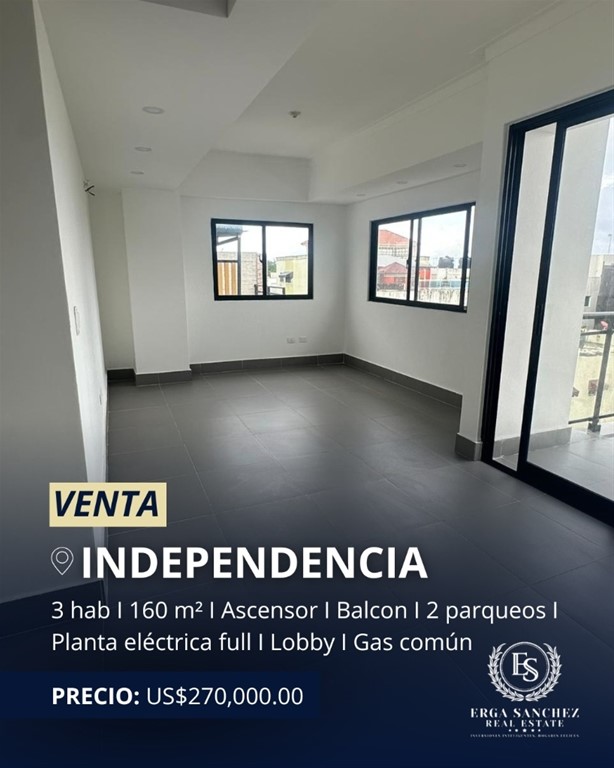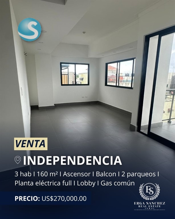 Exclusivo Apartamento A ESTRENAR en La Independencia Descubre este exclusivo apartamento ubicado en La Independencia, diseñado para brindarte comodidad, elegancia y funcionalidad en cada espacio. CARACTERÍSTICAS: 160 m² netos 3 habitaciones, cada una con su baño y walk-in closet Habitación de servicio con su baño Cocina en roble Amplio balcón para disfrutar 2 parqueos paralelos 5to piso AMENIDADES: Planta eléctrica full Ascensor Lobby climatizado Gas común con medidor individual PRECIO: US$270,000.00 Vive en una zona tranquila, céntrica y con excelente acceso en La Independencia #JV