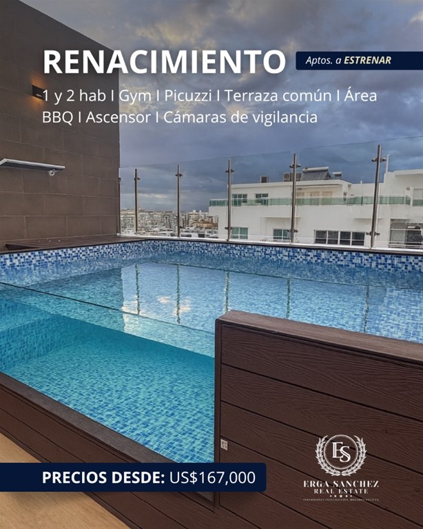 Exclusivo proyecto de Aptos. A ESTRENAR en el codiciado sector de RENACIMIENTO Torre residencial lista para entrega inmediata, con apartamentos totalmente nuevos y a estrenar, ubicada próximo al Parque Mirador Sur, una de las zonas más valoradas de Santo Domingo. Ofrece apartamentos de 1 y 2 habitaciones, con excelentes terminaciones y áreas sociales completas, ideales tanto para vivir como para invertir. CARACTERISTICAS Y AMENIDADES: Torre con elevador de última generación Gas común Pisos en porcelanato Madera preciosa 4 niveles de parqueos Intercom con video cámara Cámaras de vigilancia en parqueos y áreas sociales Lockers opcionales en venta AREAS SOCIALES: Picuzzi Gimnasio totalmente equipado Terraza destechada Área BBQ Kitchenette Sala de TV Baños comunes Acceso WIFI en áreas sociales TIPOS: 1 HAB Desde 58 m² ? US$167,000 2 HAB 74.70 m² ? Desde: US$201,150 Una torre pensada para quienes buscan comodidad, ubicación y una inversión segura. ¡Contáctanos!