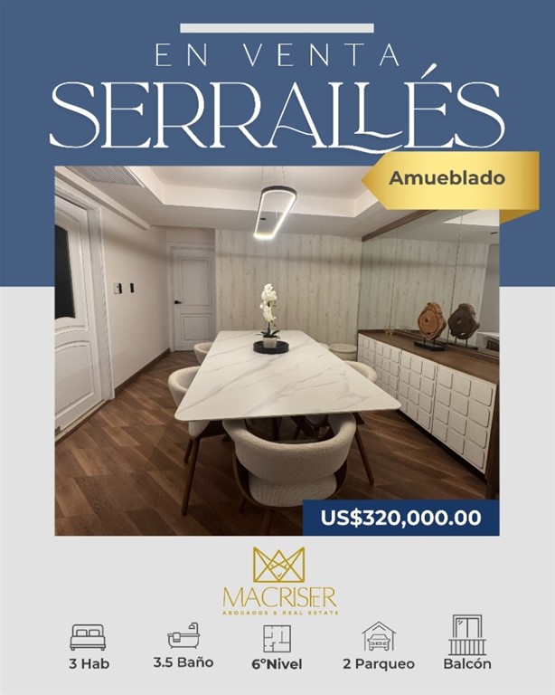 Edificio clásico en Serrallés APTO AMUEBLADO Distribución | 183 m² 3 Habitaciones (principal con walk-in closet, todas con baño) 1 Estudio 3.5 Baños Sala amplia Comedor Cocina moderna Balcón con vista Piso 6 2 Parqueos La torre: Edificio clásico en Serrallés Ascensor Seguridad 24/7 Precio de venta: US$ 320,000 Espacios amplios, ubicación privilegiada y una excelente oportunidad de inversión. Contáctame para más información o coordinar visit