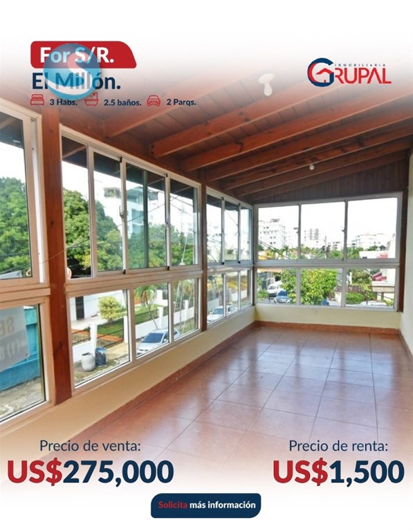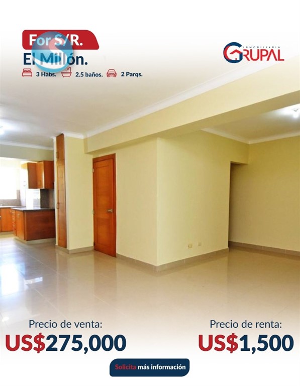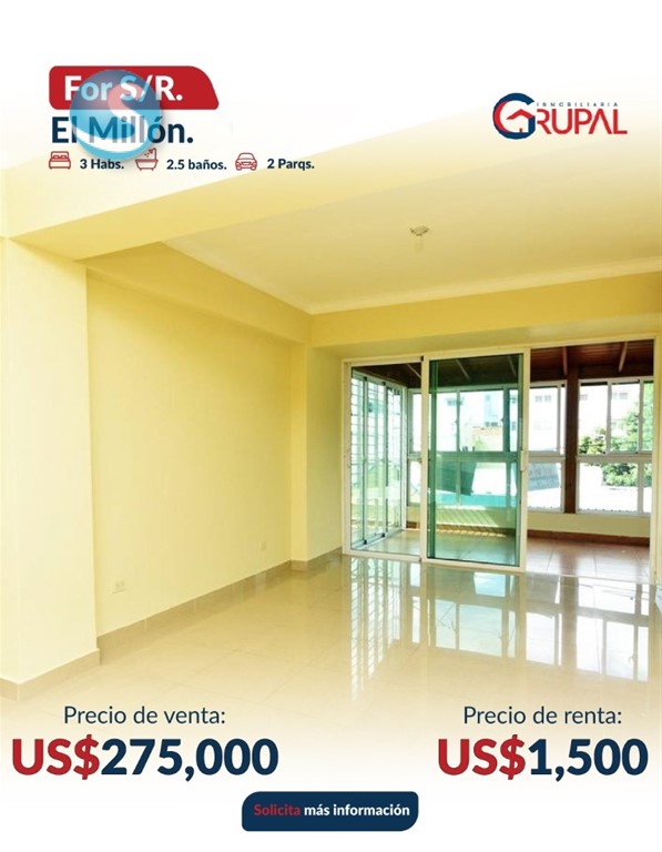 Apartamento con TERRAZA en Venta o Renta, El Millón Características del Apartamento - Sala - Comedor - Cocina con desayunador - Terraza techada y destechada, ideal para compartir - 3 habitaciones - 2.5 baños - Habitación principal con walk-in closet y baño privado Características de la Torre: - Ascensor - Planta eléctrica full - Seguridad 24 horas - Cámaras de seguridad - Parqueos paralelos y techados - Portón eléctrico - Gas común Precio de alquiler: US$1,500 (vacío) Precio de Venta: US$275,000 Información: 849-506-5220