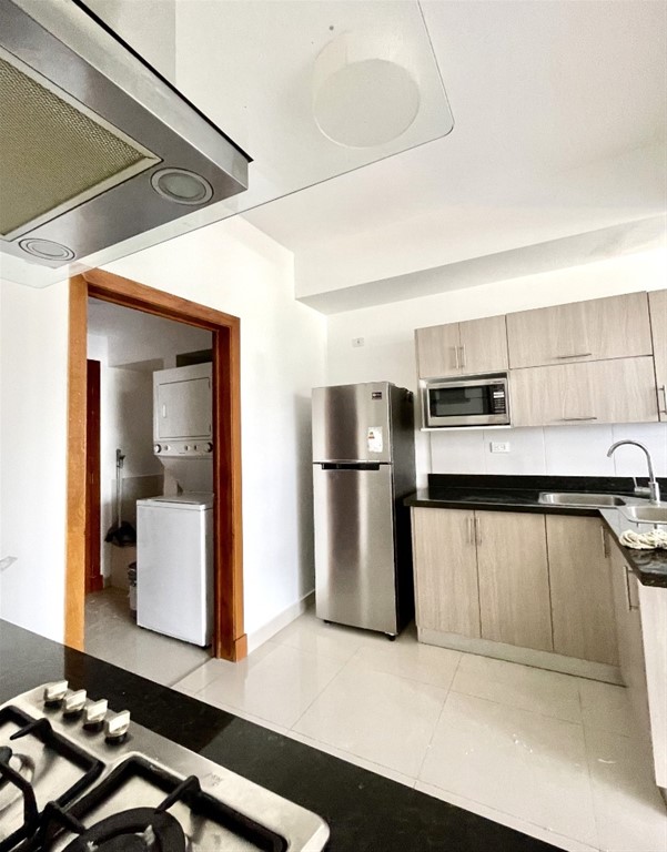 Apartamento con linea blanca, buena distribucion 1 habitacion con Walking Closet 1 bano en la habitacion 1 bano visitas sala comedor cocina abierta y moderna con desayunador area lavado 2 parqueos techados Torre: gimnasio, playground, salon multiusos, ascensores, lobby , salon de choferes, planta full, seguridad, camaras, control accesos, parqueos de visitas y zona muy tranquila en calle sin salida El apartamento tiene, aires acondicionados inverter en la habitacion y sala, nevera, estufa y extractor, microondas y lavadora y secadora, calentador de agua de linea e intercom.