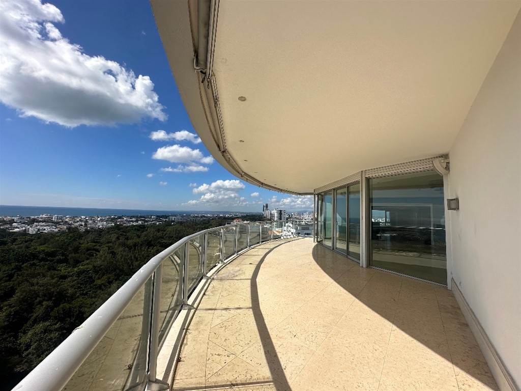 Es la segunda Torre más alta de República Dominicana, cuenta con 40 niveles. El edificio está compuesto principalmente por el amplio Lobby con triple altura, las áreas de servicios, un helipuerto en la azotea para uso exclusivo de los residentes. Balcón frontal ofreciendo el disfrute de 160 grados de esplendor orientado hacia el azul del mar y el verdor de nuestro parque Mirador Sur, DESCRIPCIÓN: 854 Metros Recibidor privado 5 parqueos techados y paralelos 4 Amplias habitaciones con baños y vestidores. La habitación principal dos vestidores, balcón privado y baño doble Enormes ventanales que dan luminosidad y elegancia con vista al mar Kitchenette y w-closet ropa blanca. 1/2 baño de visitas. 2 Amplias salas. Comedor formal. Estudio y terraza techada. Áreas de servicios independientes cocina fría y cocina caliente Comedor Área para la despensa y área para cristalería. Hermosa cava para almacenar botellas de vin.os Cocina caliente. Área de lavado con sus instalaciones para electrodomésticos y gabinetes. TERMINACIONES: Pisos en mármol envejecido Techos en Sheetrock y yeso Ventanas anticiclónicos y antiruidos de doble cristal., Shutters en todas las ventanas Baños, tope y lavamanos en piezas de mármol envejecido (habitaciones y visita). 2 Cocinas modular importada. Cedro en todos los vestidores, y closets. Sistema contra incendio con sus sensores en todo el apartamento. Sistema de aire acondicionado central climatizado 2 habitaciones de servicios (Revestimiento en mármol en los baños de servicios) área de lavado. Puertas en caobas con jambas. AMENIDADES DE LA TORRE: Primer nivel. Lobby de triple altura, ideal para transmitir una sensación de ambiente tropical. 4 Ascensores 2 ascensores de servicio Seguridad 24 horas. Áreas para choferes independientes Áreas recreativas y sociales bajo techo y al exterior. Mascotas permitidas, Salón de baile, 2 Bares, Área común con piscinas para adulto y dos piscinas para niños. Dos salones con área de apoyo con cocina. Baño y bar. Dos área de barbacoa. Área de jardinería. Media cancha de baloncesto y paddle de tenis. Aeróbicos y área de vestuario con baños y ducha. Salón de belleza. Gimnasio. Piscina térmica. Baño turco y de vapor, sauna y baño hidromasaje.