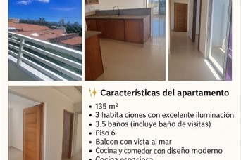 USD 220,000 Torre de lujo en zona universitaria Vista panorámica Metros 135 Balcón vista al mar 3 habitaciones Cuarto de servicio con baño 3 baños y 1/2 , piso 6 2 parqueos techados Lobby climatizado Gimnacio , seguridad 24/7 2 ascensores Área de juegos Salón de eventos multiusos Av. José Contreras , Mantenimiento 8,166 pesos x mes