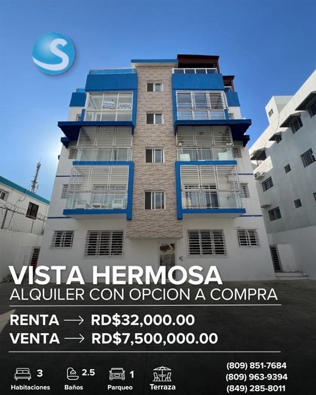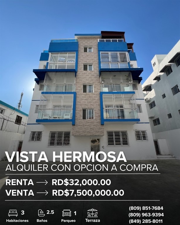 Apartamento de Venta en Vista Hermosa Precio: RD$7,500,000 Metrajes: • Apartamento: 105.00 m² • Parqueo: 12.50 m² • Terraza: 45 m² • Metro total: 162.50 m² Nivel: 4to Características: • 3 Habitaciones • 2.5 Baños • Cocina amplia • Balcón integrado • Terraza privada con gazebo y jacuzzi • Área de lavado • 1 Parqueo