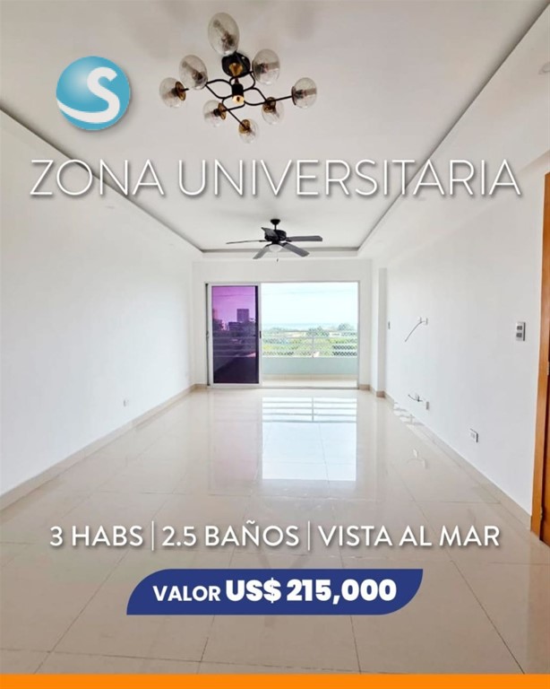 zona universitaria /Vista al mar/ Inversión inteligente Vive o invierte en Zona Universitaria, frente a la UASD. 135m2 en piso 6 con balcón y vista panorámico 3 habitaciones 2.5 baños 2 parqueos techados Cuarto de servicio con baño Torre con Lobby climatizado, gimnasio, salón multiusos, área de juegos, 2 ascensores y seguridad 24/7. US$ 215,000 Mantenimiento: RD$ 8,166 Ubicación estratégica + alta demanda = decisión segura. Contáctame y agenda tu visita