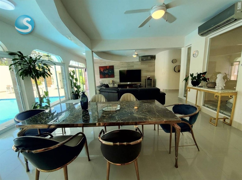 Exclusiva residencia en Santo Domingo Oeste Impresionante casa de dos niveles con amplios espacios y un diseño pensado para el confort, la privacidad y el disfrute familiar. Metraje total: 785.18 m² Distribución: 4 dormitorios, cada uno con baño (principal con vestidor y estar) Varias salas: recibidor, sala principal, secundaria y tercera Comedor principal y comedor de diario Cocina caliente y despensa Área de lavado y cuarto de servicio con baño Oficina y estar familiar Marquesina doble y espacio para hasta 4 parqueos Área social ideal para disfrutar: Piscina Jacuzzi Terraza y amplios espacios alrededor de la piscina Estatua decorativa en yeso AMUEBLADO Venta: US$790,000 Alquiler: US$3,500 Una propiedad perfecta para quienes buscan amplitud, comodidad y elegancia en cada espacio. #3035
