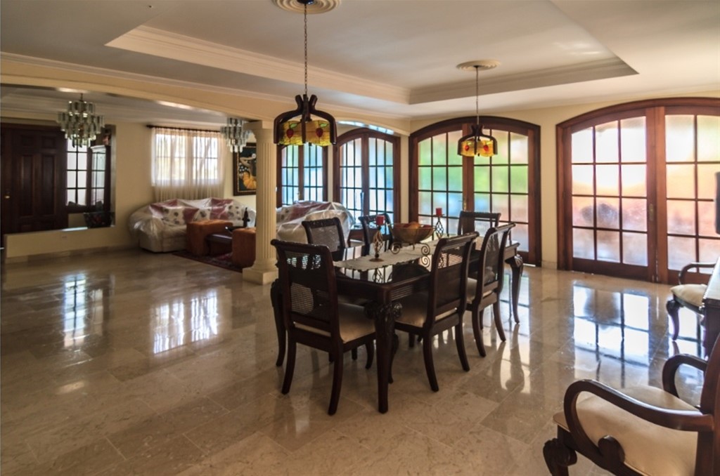 Casa en venta en Arroyo Hondo III, 2 niveles, mármol, caoba, patio, balcones y piscina IDEAL PARA FAMILIA GRANDE, EMBAJADAS O DELEGACIONES, DOS NIVELES DE CONSTRUCCION 1er Nivel 2 Cocina (Caliente y fría) Amplia Sala con grandes ventanales Comedor con capacidad de mesa de 12 sillas Piso mármol y decoración en caoba Amplia terraza frente a la piscina 2do Nivel 5 habitaciones Doble altura Habitación principal baño con jacuzzi, walk-in closet, ducha moderna y balcón privado 3 baños Salón de Estar Amplio balcón familiar Facilidades de La Casa Área verde, jardinería y BBQ Piscina, baño vestido y ducha Parqueos para 4 vehículos Cuarto de servicio y cuarto de desahogo Cisterna/bomba Amplio Sótano Cerca de Price Smart y la embajada de los Estados Unidos, principales supermercado y tiendas del país, educación, deporte y recreación
