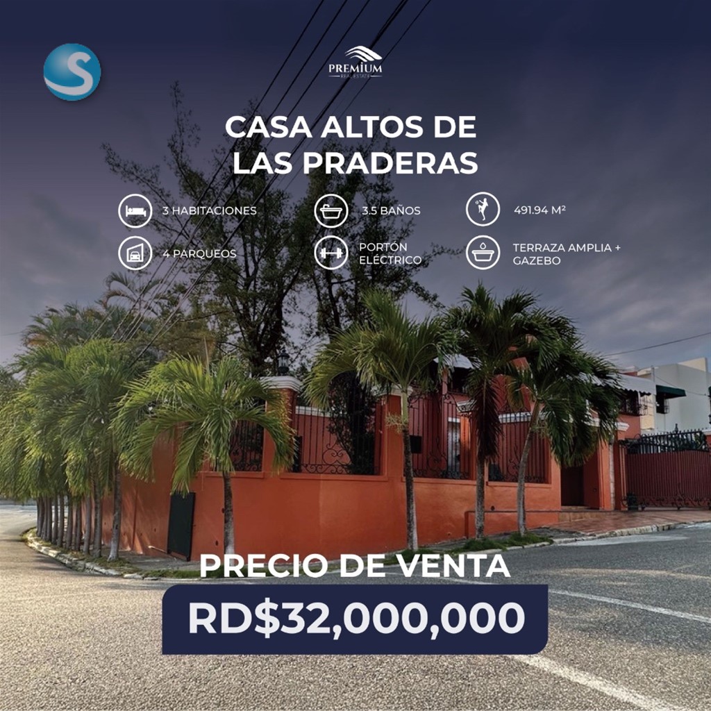 Casa Altos de Las Praderas 347.34 de construccion 491.94 solar Marquesina para 4 vehículos Vestíbulo 2 Salas Comedor 2 Estar Familiar Estudio Cocina Fría Cocina Caliente Área de lavado Cuarto de servicio con baño 3 Habitaciones principal con W/C 3.5 Baños Terraza amplia Gazebo Patio Panel solar para calentador Inversor trace 8 baterias Portón Eléctrico Terminaciones de Primera: Pisos en Marmol Puertas,revestimientos y closet Caoba Tope de Granito Natural Negro en cocina Precio de Venta RD$32,000,000