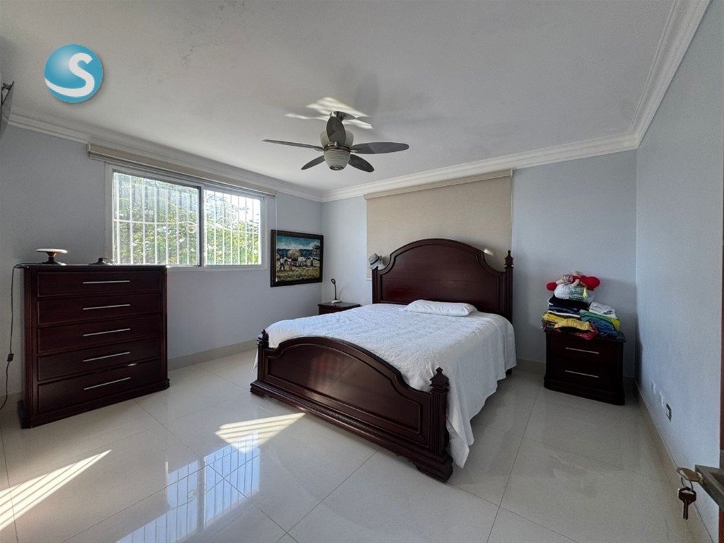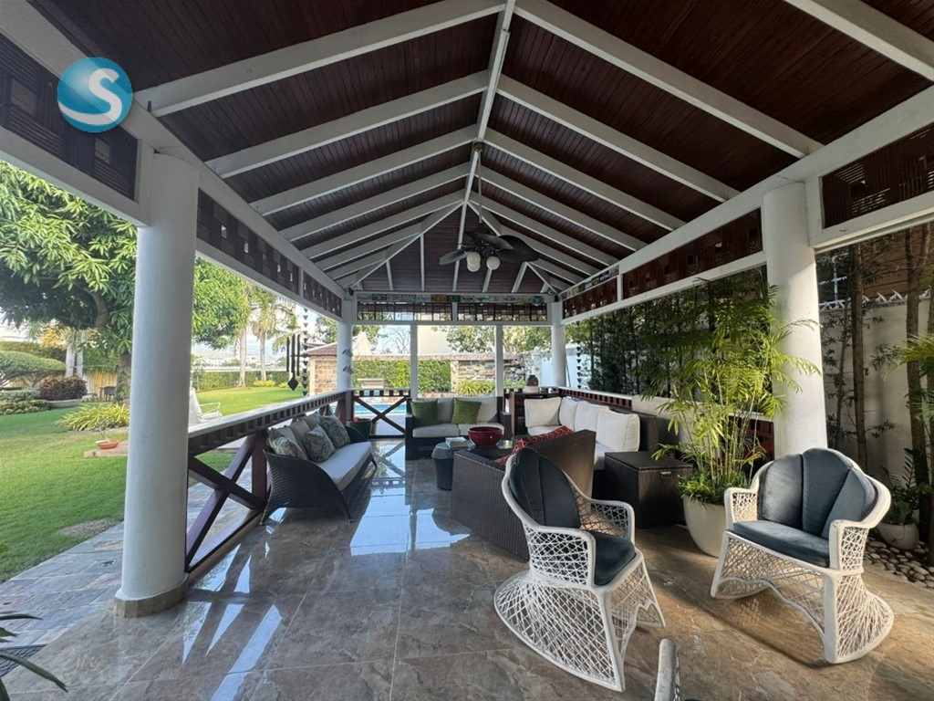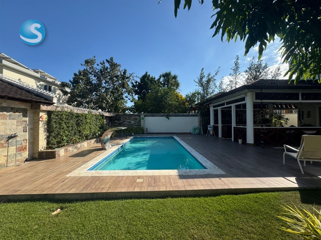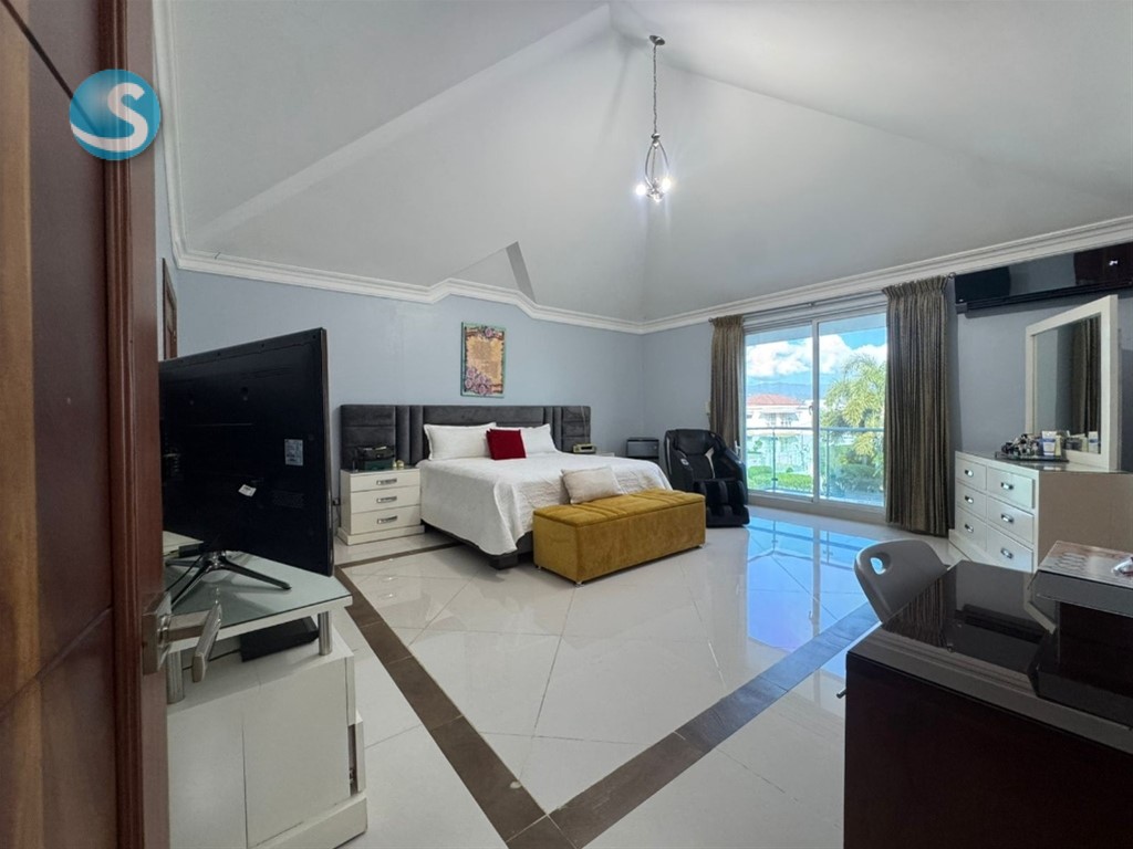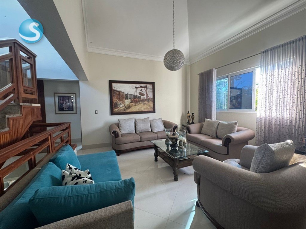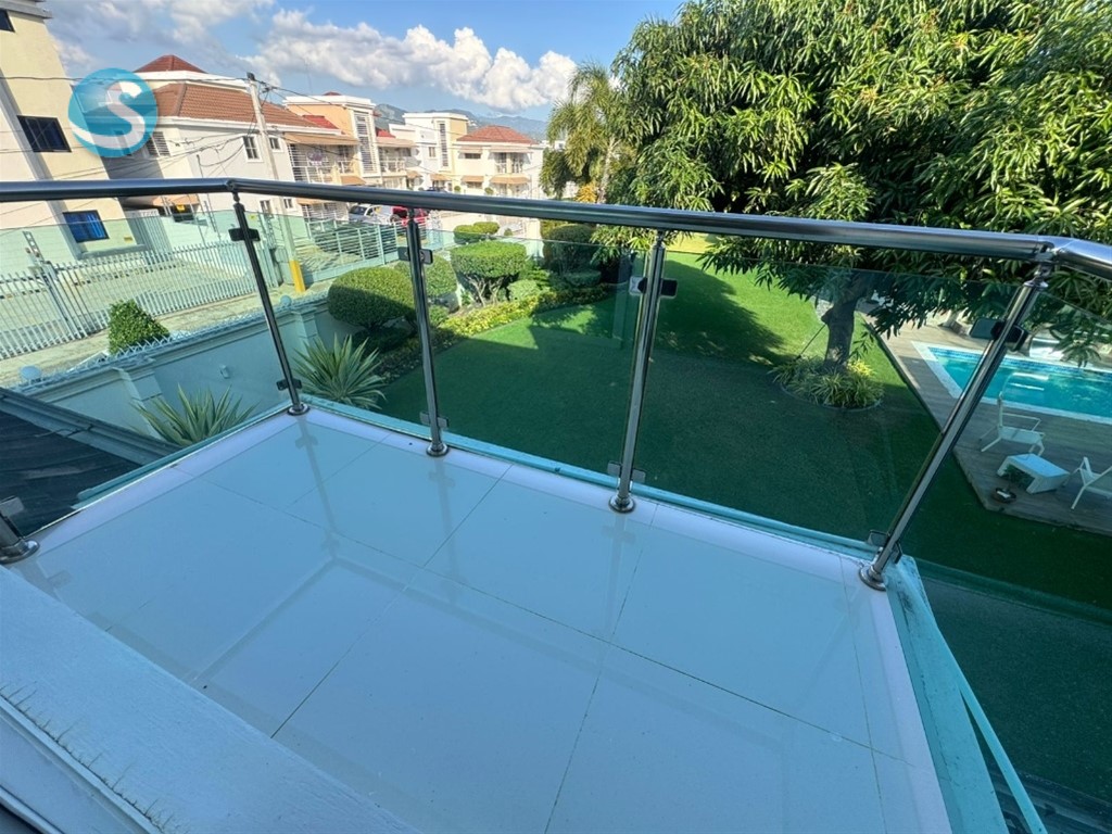 CASA DE LUJO EN VENTA Descripción Impresionante residencia con una de las jardinerías más hermosas de la zona, diseñada para quienes valoran la amplitud, elegancia y confort en cada espacio. Distribución La propiedad cuenta con una acogedora galería, sala formal con recibidor, amplia sala comedor y una elegante escalera revestida en mármol y madera que aporta distinción al ambiente. Dispone de una moderna cocina, sala de estar climatizada, terraza ideal para el entretenimiento, amplio patio y una atractiva piscina. La marquesina tiene capacidad para 8 vehículos, brindando comodidad y funcionalidad. En el segundo nivel se encuentran 5 habitaciones, cada una con su baño privado. La habitación principal incluye walk-in closet y balcón, además de una sala familiar con acceso a balcón. Dimensiones 740 m² de construcción 1,237 m² de terreno Terminaciones y equipamiento Madera en caoba centenaria Pisos en porcelanato Grifería y cerraduras de alta gama Cisterna con bomba de agua Sistema de alarma Cámaras de vigilancia Intercom Cerco eléctrico Portón eléctrico Precio US$900,000