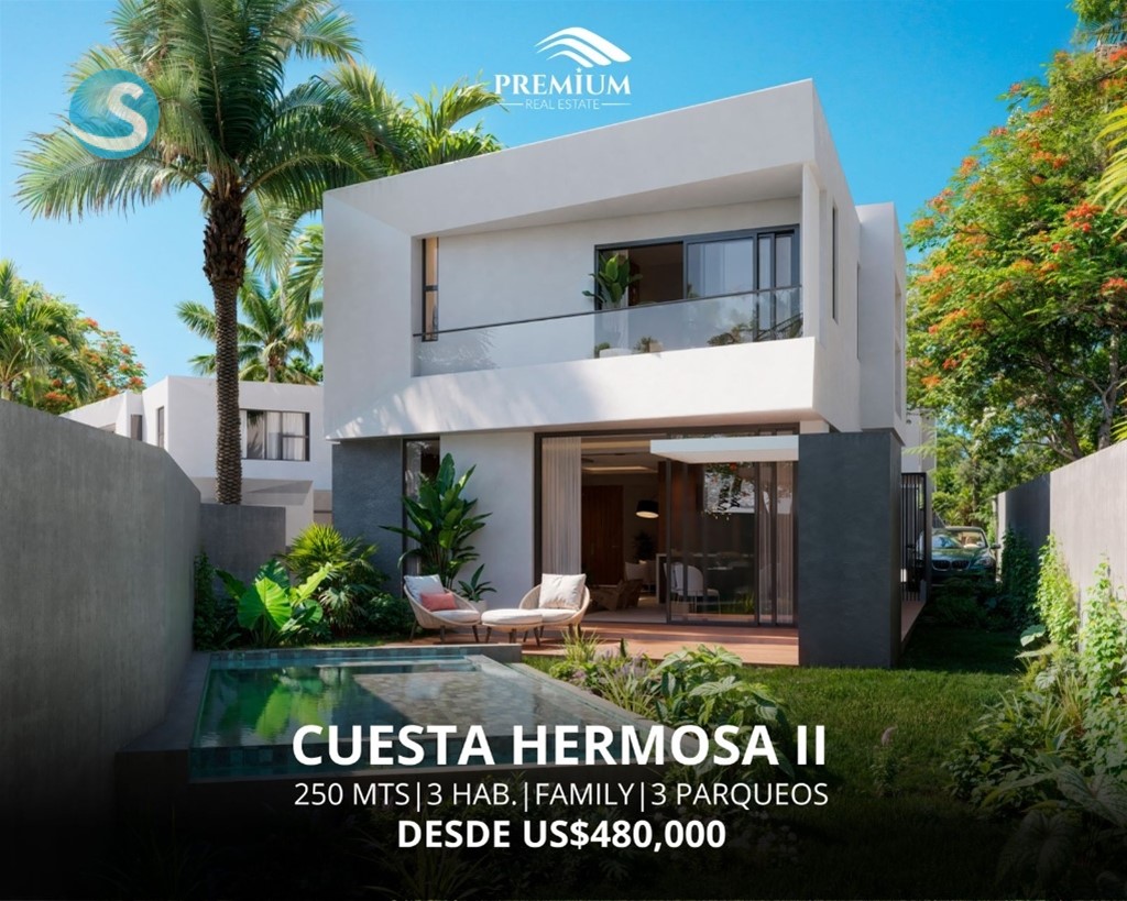 Cuesta Hermosa II ?? Desde US$480,000 Si buscas un lugar seguro y exclusivo, conoce conmigo este proyecto de solo 4 CASAS, con seguridad 24 horas: ?250 metros de construcción ?3 habitaciones, cada una con baño y W/C ?Family o 4ta habitación ?Baño de visitas ?3 parqueos ?Recibidor ?Amplio patio ?Área de lavado, cuarto de servicio Pregunta por la opción de incluir una piscina y cocina caliente a tu casa por un monto adicional ???? ?Entrega: Noviembre 2026 Reserva con US$5,000 Haydée López Premium Real Estate (829) 875-9881