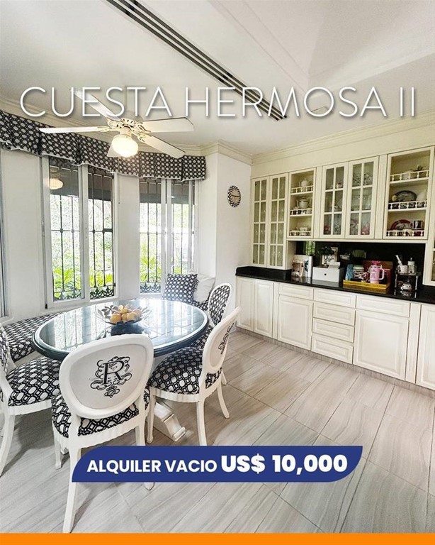 Espectacular residencia en Cuesta Hermosa II: 1,478 Mts2 total 800 mts2 de construcción Dos (2) niveles 1er nivel : -Recibidor -Estudio con proyector (1 ) Habitación para visitas con Baño y W/C -Baño para visitas -Sala amplia -Comedor cerrado -Amplia área tipo terraza -Terraza exterior techada -Piscina con cascada -Cocina fría -cocina caliente -Área de Lavado -Área de Servicio ( 2 habitaciones ) 3 closets para vajilla -Amplio patio -Jardín frontal Baño en el área social Cuarto de máquinas y bomba Área de chofer 2do Nivel: -Tres (3 ) Habitaciones cada una con W/C -Cuatro (3 ) Baños -Habitación principal con terraza privada y 2 W/C en cedro Baño revestido con marmol carrara . Family Room Kichenette Closet ropa blanca . Terminaciones : -Pisos en Marmol -Madera preciosa -Planta eléctrica -Inversor -Calentador de gas -Cuarto de desahogo en jardín Paneles 6 parqueos VENTA; US $2,500,000.00 Alquiler amuebladoa $15,000.00 Alquiler vacío $10,000.00 #2962