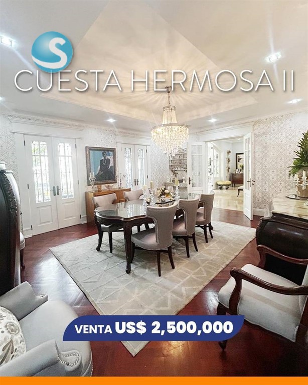 Espectacular residencia en Cuesta Hermosa II: 1,478 Mts2 total 800 mts2 de construcción Dos (2) niveles 1er nivel : -Recibidor -Estudio con proyector (1 ) Habitación para visitas con Baño y W/C -Baño para visitas -Sala amplia -Comedor cerrado -Amplia área tipo terraza -Terraza exterior techada -Piscina con cascada -Cocina fría -cocina caliente -Área de Lavado -Área de Servicio ( 2 habitaciones ) 3 closets para vajilla -Amplio patio Jardín frontal Baño en el área social Cuarto de máquinas y bomba Área de chofer 2do Nivel: -Tres (3 ) Habitaciones cada una con W/C -Cuatro (3 ) Baños -Habitación principal con terraza privada y 2 W/C en cedro Baño revestido con marmol carrara . Family Room Kichenette Closet ropa blanca . Terminaciones : -Pisos en Marmol -Madera preciosa -Planta eléctrica -Inversor -Calentador de gas -Cuarto de desahogo en jardín Paneles 6 parqueos VENTA; US $2,500,000.00 Alquiler amuebladoa $15,000.00 Alquiler vacío $10,000.00 #2962