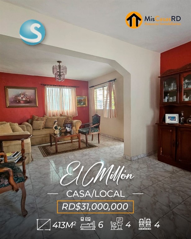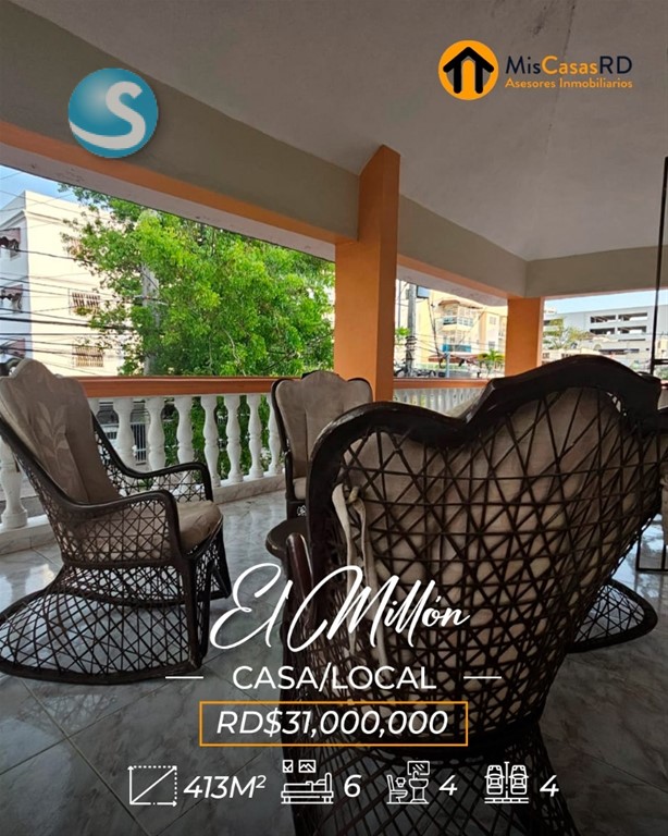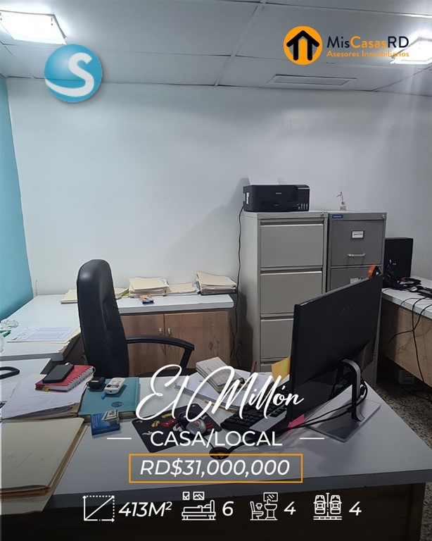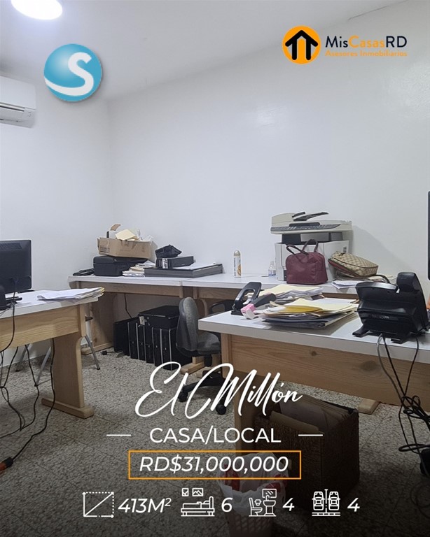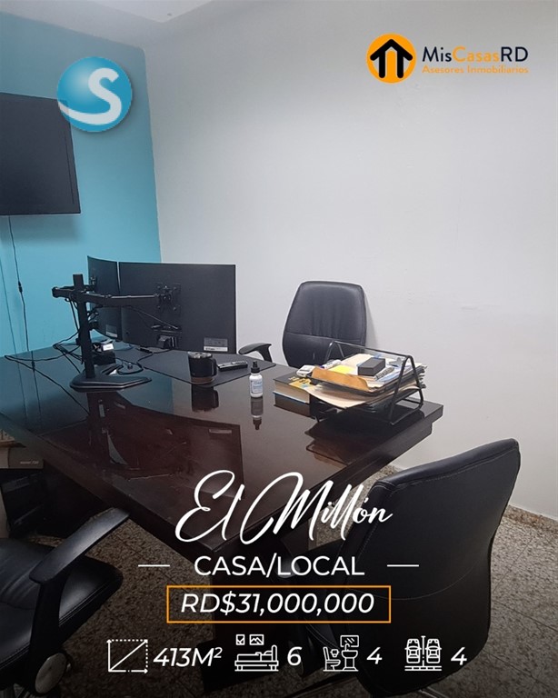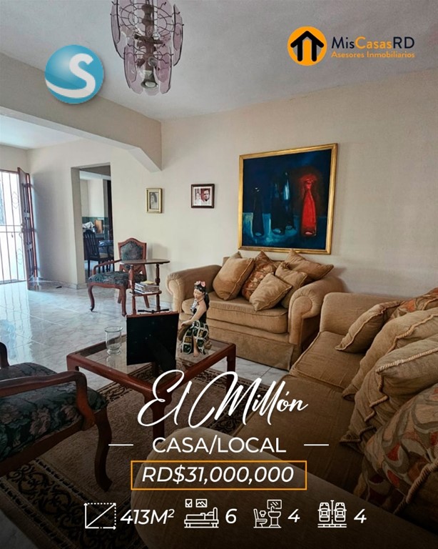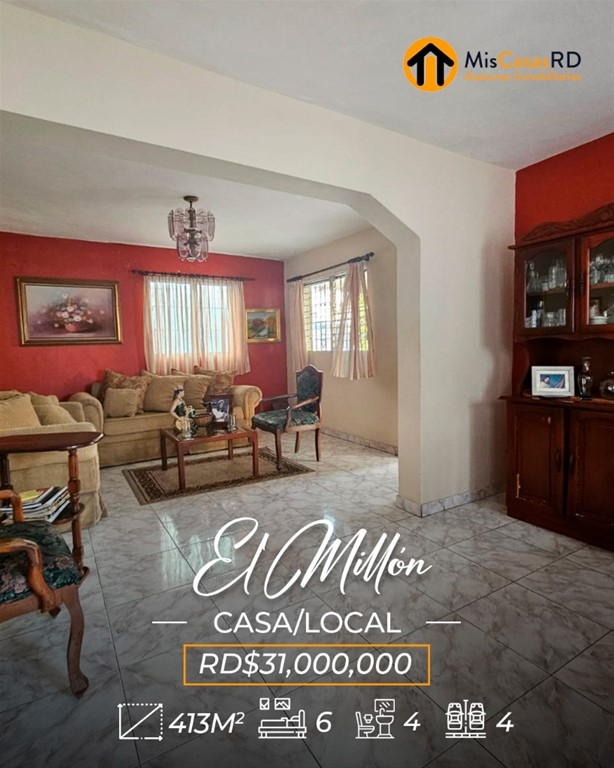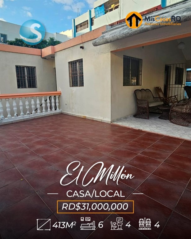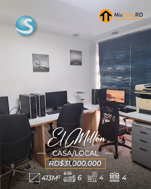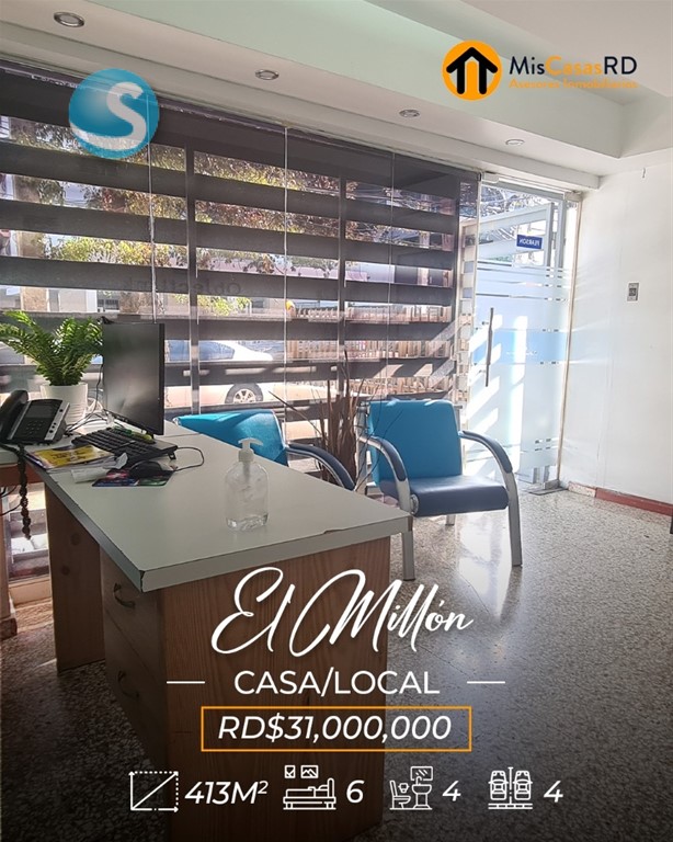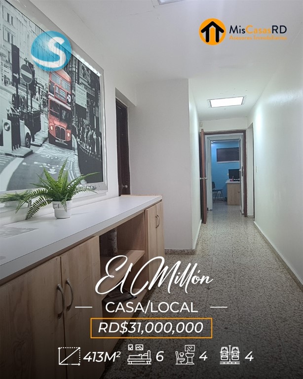 ?? Propiedad en venta en El Millón ?? Excelente oportunidad en una ubicación privilegiada, a tan solo una esquina de la Av. 27 de Febrero, una de las avenidas más importantes del Distrito Nacional. Esta propiedad de dos niveles ofrece gran versatilidad para uso comercial, empresarial o residencial. ?? Primer nivel: Ideal para oficinas, call center, salón de conferencias o cualquier tipo de negocio. Cuenta con amplios espacios, cocinas, baños y un área de recepción. Un lugar donde puedes dejar volar tu imaginación y desarrollar tu próximo proyecto. ?? Segundo nivel: Actualmente acondicionado como vivienda, dispone de: Amplia terraza Sala y comedor Cocina 3 habitaciones con clósets 2 baños Excelente distribución y ventilación ?? Terreno: 379 m² ?? Construcción: 413 m² Si tu idea es remodelar, demoler o construir un nuevo proyecto, esta es una excelente opción: justo al frente y al lado hay edificaciones de 3 y 4 niveles, lo que ofrece gran potencial de desarrollo. Perfecta también para: Escuela de baile, danza, música, ballet, yoga, pilates, gimnasio, recovery home, centro estético, clínica de rehabilitación, oficinas, empresa, o servicios de delivery como Pedidos Ya o Uber Eats. ? Gana tiempo y ejecuta ese proyecto que tienes en mente. ?? Contáctanos hoy mismo en MisCasasRD Asesores Inmobiliarios y coordina tu cita.