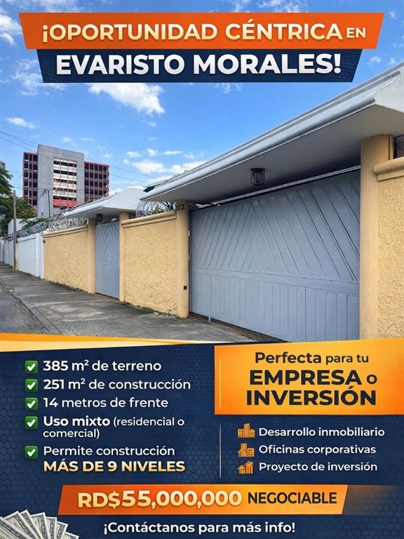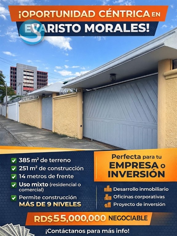 Oportunidad única en Evaristo Morales! Invierte en una propiedad con alto potencial en una de las zonas más estratégicas de la ciudad. A solo pasos de la Av. Winston Churchill, ideal tanto para uso residencial como comercial. Características: • 385 m² de terreno • 251 m² de construcción • 14 metros de frente • Uso mixto (residencial o comercial) • Permite construcción de más de 9 niveles Perfecta para: • Desarrollo inmobiliario • Oficinas corporativas • Proyecto de inversión Ubicación privilegiada + alto potencial de valorización Precio: RD$55,000,000 (negociable) Contáctanos para más información o agendar visita. Sugeiley Ozuna 809-885-0795 Kw Capital