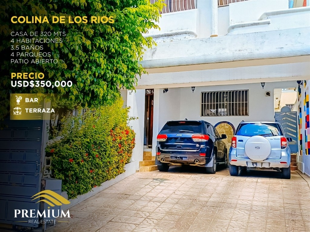 Colinas de los Ríos ?? ?? Hermosa casa de dos niveles ? 320 mts ? 4 habitaciones ? 1 Habitación estudio con su balcón ? 3.5 baños ? Cuarto de servicio ? 4 parqueo ? Sala comedor ? Recibidor ? Patio ? Terraza ? Escalera en madera preciosa ? Bar ? Planta eléctrica ? Área de lavado ? Recibidor ? Amplia cocina ? Patio abierto ? Aire acondicionados ? Tinacos ? Cisterna ?? US290,000