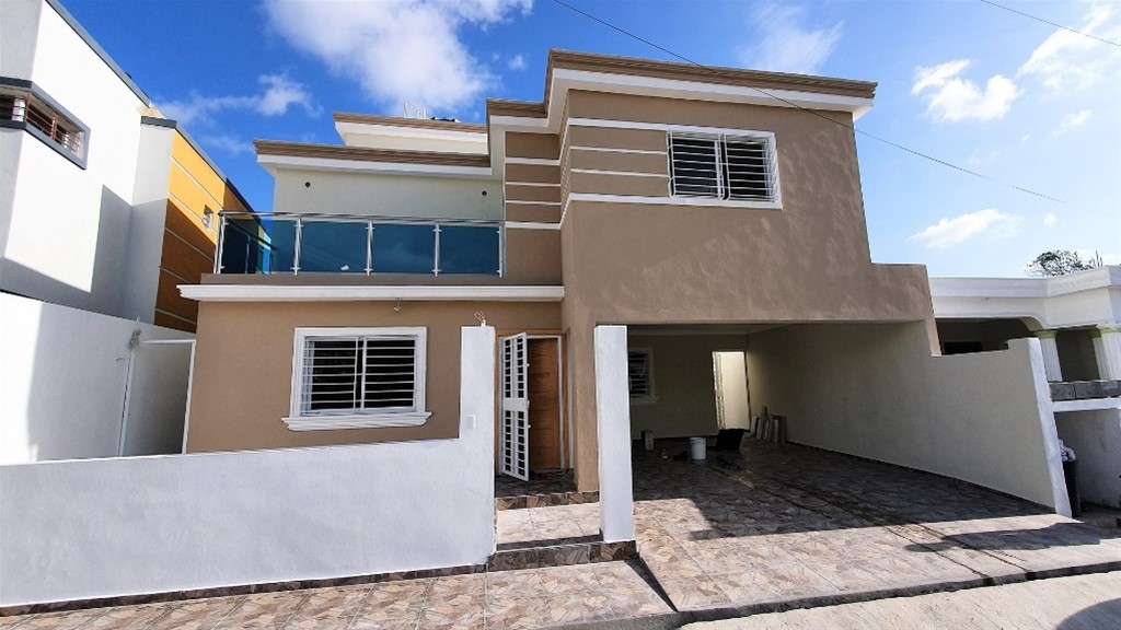 Casa en venta en Residencial Los Hidalgos, Santo Domingo Oeste. Km.14 Autopista Duarte entrando por el Banco Popular. Precio USD $220,000 Área de construcción 230 Mts2 Área de terreno 285 Mts2 3 Habitaciones cada una con sus baños y w/c 2 medios baños de visitas Sala y comedor separados Estar familiar Estudio Cocina y área de lavado 2 parqueos techados 285m de solar y 230 metros de construcción + azotea Azotea con acceso interno desde la casa con 1/2 baño Patio trasero Tentaciones de primera y modernas Residencial cerrado con garita seguridad 24/7 con cámaras Cisterna y pre instalación de tinaco Circuito de energía 24 horas Para entrega en 6 meses Separa con 10% y completa el inicial del 20% en 6 meses. 70% Contra entrega, mediante financiamiento. Clave Interna PVC-005-12-20