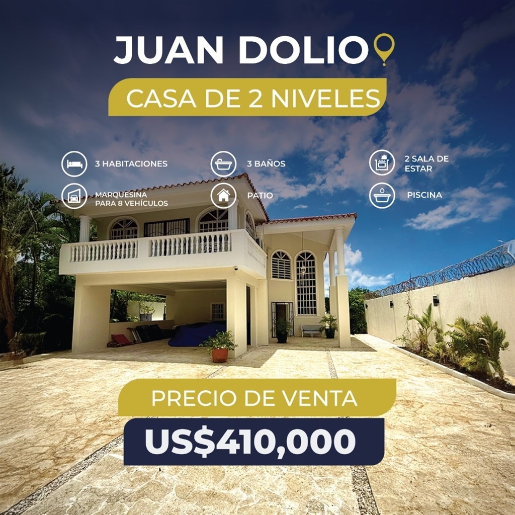 Juan Dolio, Marbella Casa de 2 Niveles 465mts de solar 240mts de construcción Primer Nivel Marquesina para 8 vehículos Portón eléctrico Sala Family Cocina Habitación de servicio Área de lavado Piscina Patio Cisterna Pozo Segundo Nivel 3 habitaciones c/u con su baño y balcón 2 sala de Estar Precio: US$410,000