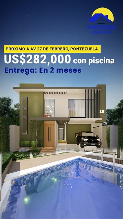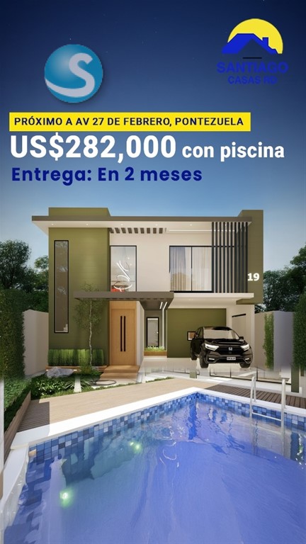 ¡La casa de tus sueños está a la venta! ?? Casa ubicada en el Residencial Palmas del Valle, Pontezuela, Santiago. Cuenta con amplios espacios para ofrecer a sus residentes un estilo de vida saludable y exclusivas áreas de recreo para el disfrute de todos. Amenidades: ? Intercom ? Residencial cerrado ? Portón eléctrico ? Cisterna ? Seguridad 24/7 ? Área verde ? Piscina ? Patio 216 Metros de Construcción | Casa de dos niveles: ? Sala ? Recibidor ? Comedor ? Cocina con Isla ? Area de lavado ? Terraza 2do nivel ? 1 hab. principal con baño, walking closet y balcón ? 2 hab. secundarias con baño común ? Closet de ropa blanca ? Calentador ? Bomba de agua ? Marquesina doble PRECIO: US$282,000.00 con la piscina incluida US$266,000.00 sin la piscina ¡Entrega en 2 meses!