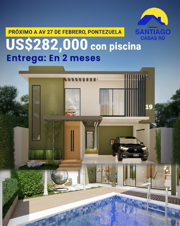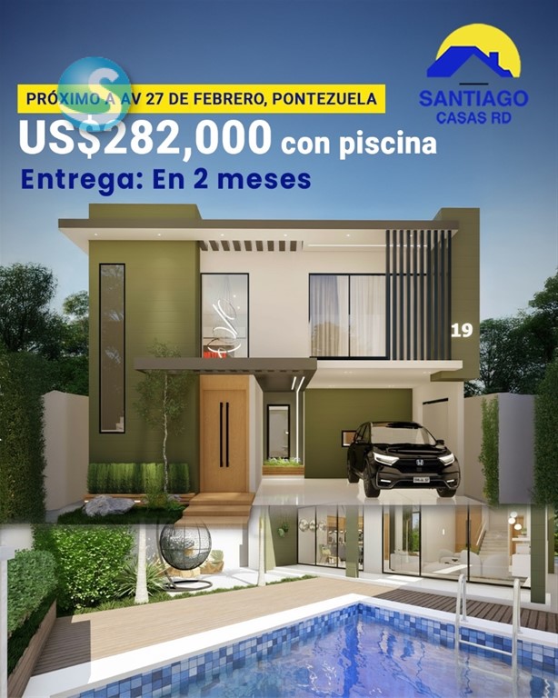 ¡La casa de tus sueños está a la venta! ?? Casa ubicada en el Residencial Palmas del Valle, Pontezuela, Santiago. Cuenta con amplios espacios para ofrecer a sus residentes un estilo de vida saludable y exclusivas áreas de recreo para el disfrute de todos. Amenidades: ? Intercom ? Residencial cerrado ? Portón eléctrico ? Cisterna ? Seguridad 24/7 ? Área verde ? Piscina ? Patio 216 Metros de Construcción | Casa de dos niveles: ? Sala ? Recibidor ? Comedor ? Cocina con Isla ? Area de lavado ? Terraza 2do nivel ? 1 hab. principal con baño, walking closet y balcón ? 2 hab. secundarias con baño común ? Closet de ropa blanca ? Calentador ? Bomba de agua ? Marquesina doble PRECIO: US$282,000.00 con la piscina incluida US$266,000.00 sin la piscina ¡Entrega en 2 meses!
