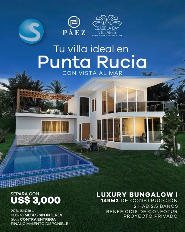 Isabela Bay – Un Proyecto Privado en Punta Rucia @isabelabay Villas y Lotes con Vistas al Mar – A Solo 5 Minutos de la Playa Descubre Isabela Bay, un exclusivo proyecto privado ubicado en el encantador destino turístico de Punta Rucia, donde las montañas se encuentran con el mar, creando un entorno natural único y vistas espectaculares. A solo cinco minutos de la playa de arenas blancas, este desarrollo ofrece dos tipologías de villas y lotes desde 400 m², ideales para construir, vacacionar o invertir. Un entorno rodeado de naturaleza, tranquilidad y belleza sin igual. ¿Por qué Punta Rucia? Punta Rucia es uno de los destinos más exclusivos y vírgenes del norte de República Dominicana. Famoso por su impresionante biodiversidad marina, sus aguas cristalinas, playas tranquilas y el icónico Cayo Arena, es el refugio ideal para quienes buscan desconectar y vivir en armonía con la naturaleza. Además, es una zona con alto potencial de crecimiento turístico e inmobiliario, lo que lo convierte en una excelente oportunidad de inversión. Tipologías Disponibles: LUXURY BUNGALOW I • Vista al mar • 149 m² de construcción • 2 habitaciones | 2.5 baños • Desde US$ 300,000 financiamiento disponible con institución bancaria Proyecto acogido a CONFOTUR Benefíciate de exenciones fiscales por 15 años Contáctanos !!