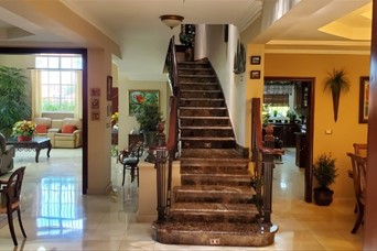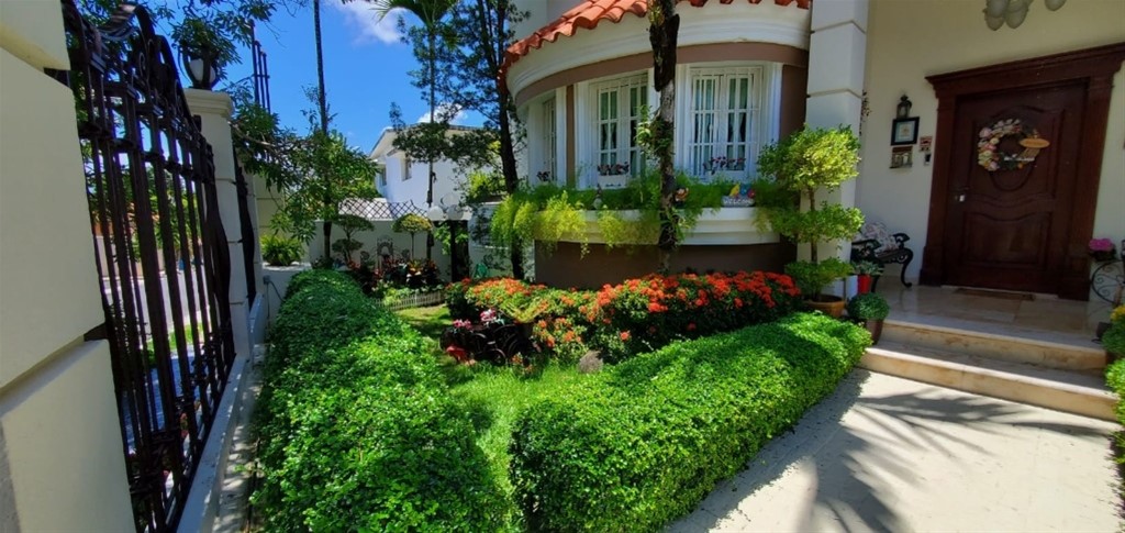 Esta espléndica propiedad se encuentra ubicada a unos 20 minutos del centro de la ciudad, en exclusivo proyecto con entrada controlada, conformado por unas 60 residencias unifamiliares, muchas de ellas de lujo, abundantes áreas verdes, completa tranquilidad y seguridad. Diseñada y construida tomando en cuenta cada detalles, esta lujosa vivienda se caracteriza por la amplitud, funcionalidad, iluminación y ventilación de sus espacios. TERMINACIONES: - Portaje y gabinetes en caoba - Cedro en el recubrimiento de closet - Pisos de mármol en área social y porcelanato en las demás. SEGURIDAD: - Puertas Multilock hacia exterior - Cámara de seguridad instaladas en toda la casa - Herraje decorativo en ventanas y baranda del nivel superior - Entrada/salida del residencial monitoreada 24/7 DISTRIBUCIÓN: Aprovechando la morfología del terreno, cuenta con dos niveles desde la entrada y un soterrado, jardines frontales y patio posterior. Se previó un espacio para instalar ascensor que actualmente funciona como closet en dos de los niveles y como jardinera decorativa en el nivel intermedio. En el piso superior se encuentra la espaciosa habitación principal, con doble walk-in closet, dos habitaciones secundarias, todas con sus respectivos baños, una oficina y acogedor family room. En el primer nivel desde la calle, nos encontramos con el recibidor; a la izquierda, un pequeño salón de estar que antecede a una cuarta habitación con closet y baño; sala principal y comedor separados por el área de circulación, un gran salón familiar con salida al exterior y la majestuosa cocina con desayunador, comedor secundario, isleta y enorme despensa. En el piso inferior, tenemos un amplio salón de juegos o actividades con su kitchenette, una habitación que puede funcionar como el quinto dormitorio, baño completo, lavandería, cuarto de desahogo y habitación de servicio con closet, espacio para dos camas twin y su propio baño. En el patio, al que se puede acceder desde tres vías, tenemos un confortable gazebo y buen espacio para realizar cómodamente cualquier reunión social. Tiene también depósito de herramientas y cuarto con baño para el jardinero. SERVICIOS: - Cisterna de 5,000 gls - Dos tinacos de 500 gls c/u - Cuarto de bomba de agua - Calentador solar - Tanque de gas propano de 55 gls - Sector con energía eléctrica permanente, no obstante, tiene inversor - Caseta para planta eléctrica Agende su cita con por lo menos 24 horas de antelación, ¡estamos para servirles!