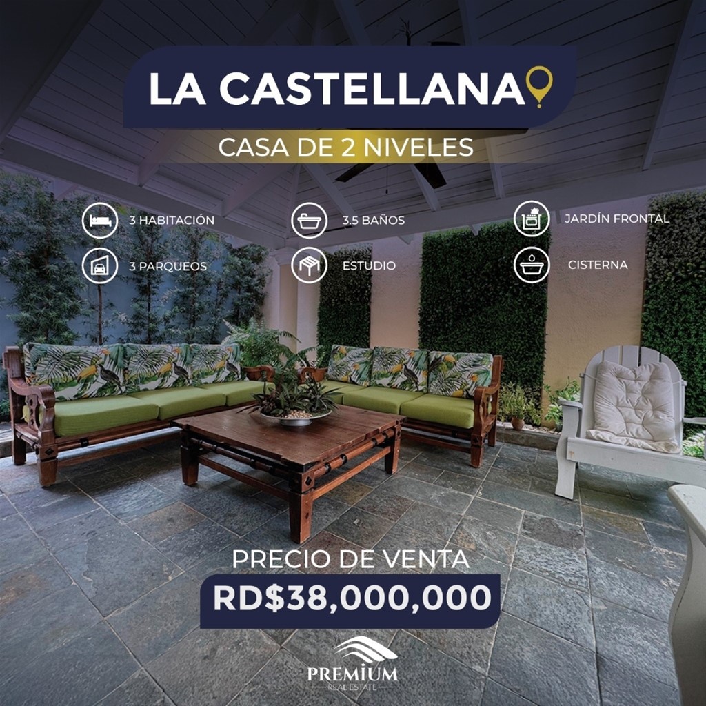La Castellana ?? Casa de 2 niveles en Venta 340 metros de construcción 600 metros total Primer nivel: Jardín Frontal Hall - Recibidor 3 Salas Terraza Techada y Destechada Comedor Cocina amplia con desayunador Area de Escalera para acceso segundo nivel Segundo Nivel: Estar familiar Estudio con Terraza destechada 3 habitaciones 3.5 baños Locker 3 parqueos Extras: Cerco Electrico Alarma Inversor Bomba de agua Cisterna 3,500 galones Pisos en marmol Precio de Venta Vacía RD$38,000,000