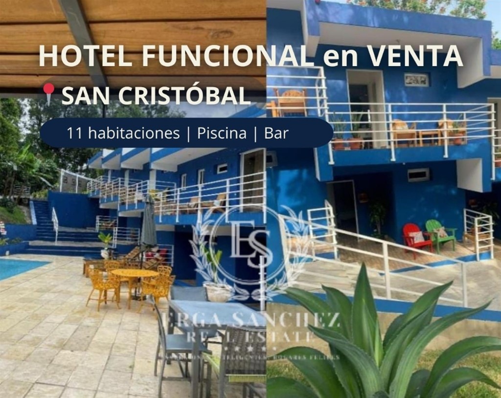 ¡Se VENDE HOTEL en Villa Altagracia, San Cristóbal! TOTALMENTE AMUEBLADO El hotel cuenta con 8 habitaciones tipo estudio y 1 apartamento de 3 habitaciones, con capacidad para hasta 30 huéspedes . Las instalaciones incluyen piscina, gazebo, bar, terraza, cocina abierta, área verde, parqueos, pozo, cisterna, tinaco, planta eléctrica e inversor . Estructura del Hotel El hotel tiene una edificación de 2 niveles con habilitación para construir un tercer nivel . El primer nivel contiene 5 habitaciones, mientras que el segundo nivel alberga 4 habitaciones y 1 apartamento de 3 habitaciones . Habitaciones del Primer Nivel Las habitaciones de (45M2 cada una) están equipadas con camas, mesitas de noche, repisas, aire acondicionado, abanico de techo, televisor, mesa con sillas, cocina completa, baño con ducha y lavamanos, agua caliente, cortinas, ropa de cama y balcón . Algunas incluyen una cama full o king size y un camarote full/twin. En el segundo nivel las habitaciones tienen balcón con vista a la piscina. El apartamento 204 (85M2) cuenta con 3 habitaciones, camas full y camarote, mesitas de noche, comedor, aires acondicionados, abanicos, TV, sofá, cocina completa, 2 baños, agua caliente, cortinas, ropa de cama y balcón con vista a la piscina . Gazebo tiene 85M2, está construido sobre columnas de concreto y techo de aluzin, con capacidad para aproximadamente 60 personas . Piscina mide 15x7 M2 con una profundidad descendente hasta 6 pies, diseñada para niños y adultos, e incluye cascada y blower tipo jacuzzi . Bar y Mini Terraza diseñado para ofrecer bebidas y picaderas, con estructura de hierro cubierto de madera y techo de aluzin . Incluye una pequeña terraza, freezer cervecero, nevera vertical, estufa, tramos en madera y equipo de música . Cocina Abierta (60M2) tiene fregadero, meseta en cemento y cerámica, una estufa industrial de 3 posiciones, y se ubica debajo del gazebo . En esta área también están las bombas de piscina y agua de la cisterna, 2 baños y área de comedor . ¡No pierdas esta increíble oportunidad! ?? Contáctanos para más detalles y agendar una visita.