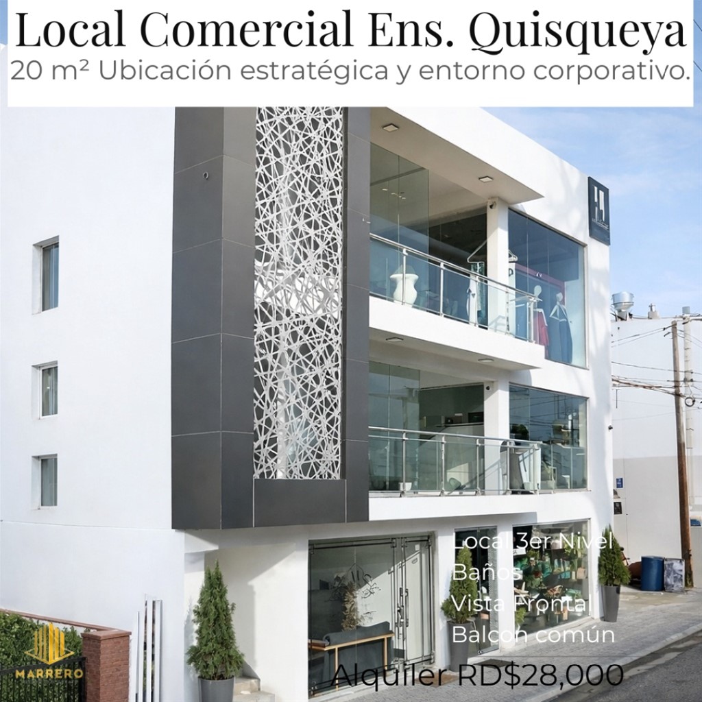 Local Comercial en Alquiler – Ensanche Quisqueya Ubicación estratégica, próximo a la Av. Gustavo Mejía Ricart, en plaza comercial con vista frontal. -3er piso -20 m² local -Baño común por piso. -Ideal para oficina, consultorio, servicios profesionales o emprendimientos. -Excelente iluminación y fácil acceso. Precio de alquiler: RD$28,000 Zona céntrica, de alto movimiento comercial y fácil conexión a vías principales. ?? Para más información o coordinar visita, contáctame.