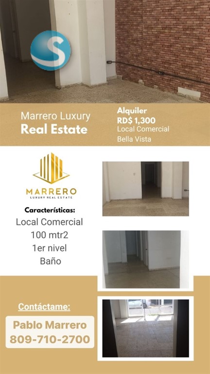 Categoría: Local Comercial Ubicación: Bella Vista Metraje: 100 mt2 1er nivel Precio Alquiler RD$1,300 Pablo Marrero / Katherine Cabrera Marrero Luxury Real Estate 809-710-2700 / 829-399-5670 Email: [email protected] Instagram: @pablo.marreroluxury / @katherine.marreroluxury marreroluxury