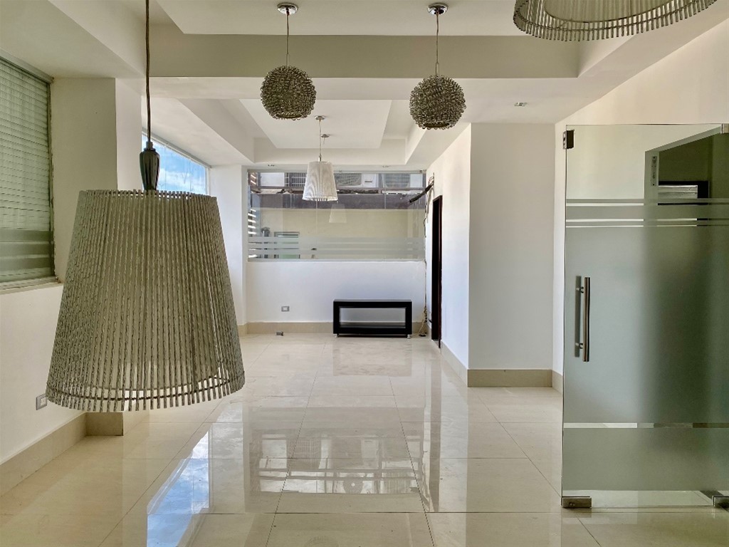Ana Castillo Cell: 809-906-3126 Amplio y moderno local comercial de aproximadamente 200 m², ubicado en el exclusivo sector de Bella Vista, ideal para oficinas corporativas, clínicas, agencias o empresas de servicios. Cuenta con amplios ventanales que proporcionan excelente iluminación natural, creando un ambiente profesional y productivo. Distribuido en varias oficinas con divisiones en cristal, área abierta para recepción o sala principal, cocina con gabinetes, comedor para empleados y 2 baños. El local dispone de shutter de seguridad, techos con diseño moderno y luminarias instaladas, ofreciendo una imagen corporativa elegante y funcional. Ubicación estratégica US$4,500 mensuales Mantenimiento incluido Espacio listo para operar y llevar tu negocio al siguiente nivel.