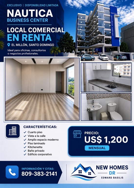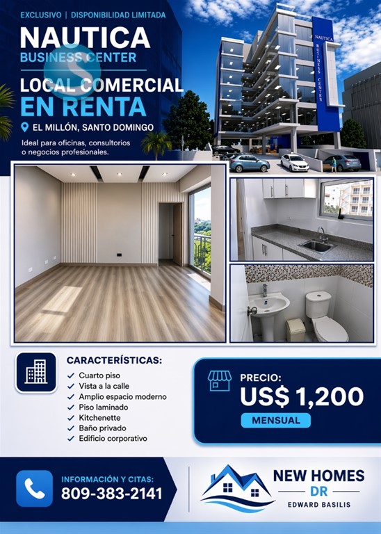 RENTO LOCALES COMERCIALES – PLAZA NÁUTICA ?? Gustavo Mejía Ricart 254, El Millón ? Disponible ?? 45 m² — US$1,200.00 mensuales ? Todos los locales listos para operar ?? Condiciones: ? Incluye mantenimiento ? No incluye impuestos ?? Amenidades del edificio: ? Ascensor moderno ? Planta eléctrica full ? Seguridad 24/7 ? Personal de limpieza ? Comedor y área de descanso ? Parqueo para inquilinos y visitantes ?? Contacto: Edward Basilis ? Oficina: 809-531-4663 ?? Celular: 809-383-2141