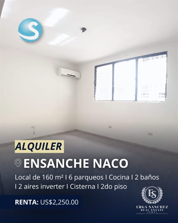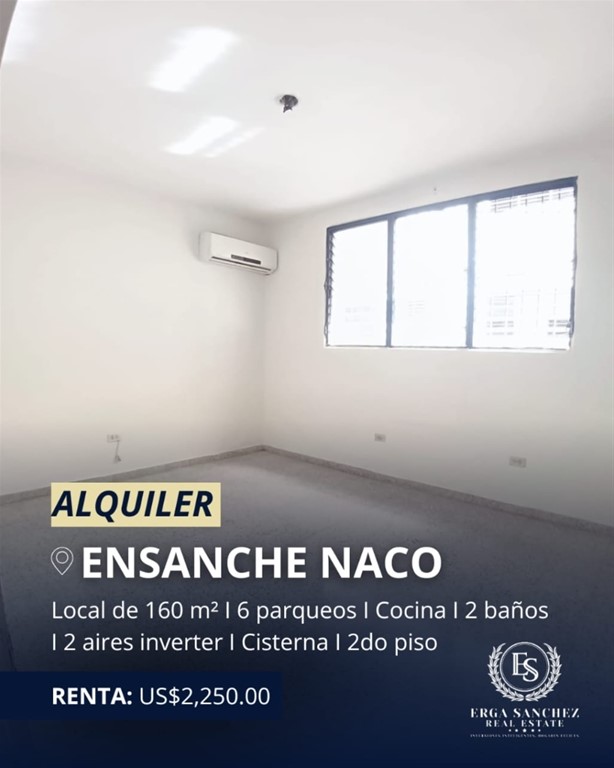 Local Comercial en ALQUILER en NACO con Excelente ubicación Disponible para todo tipo de negocios como clínicas, oficinas, restaurantes, estéticas, etc. CARACTERISTICAS Y AMENIDADES: 2do. piso con entrada independiente 160 mts2 6 Parqueos privados Amplias áreas para oficinas 2 baños Cocina Cisterna Incluye 2 aires acondicionados inverter ALQUILER: US$2,250.00 #KL